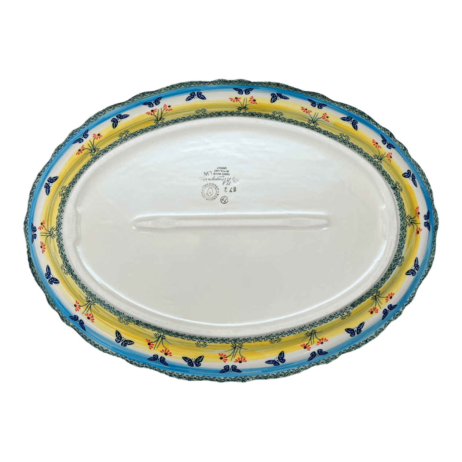 Not only is this platter a visual delight, but it's also a testament to exceptional craftsmanship. Each piece is hand-painted in Boleslawiec, Poland, by artisans who have reached the pinnacle of pottery artistry. The "Butterflies in Flight" is a Signature pattern, meaning it’s crafted by artists who oversee their creations from inception to final product, ensuring every detail is perfect. These artists earn the privilege to design these unique patterns, making each platter a rare collector's item adorned with the prestigious "UNIKAT" stamp and the artist's signature. This level of artistry makes the platter not just a serving item but a true work of art, perfect for gracing your table or adorning your display cabinet.