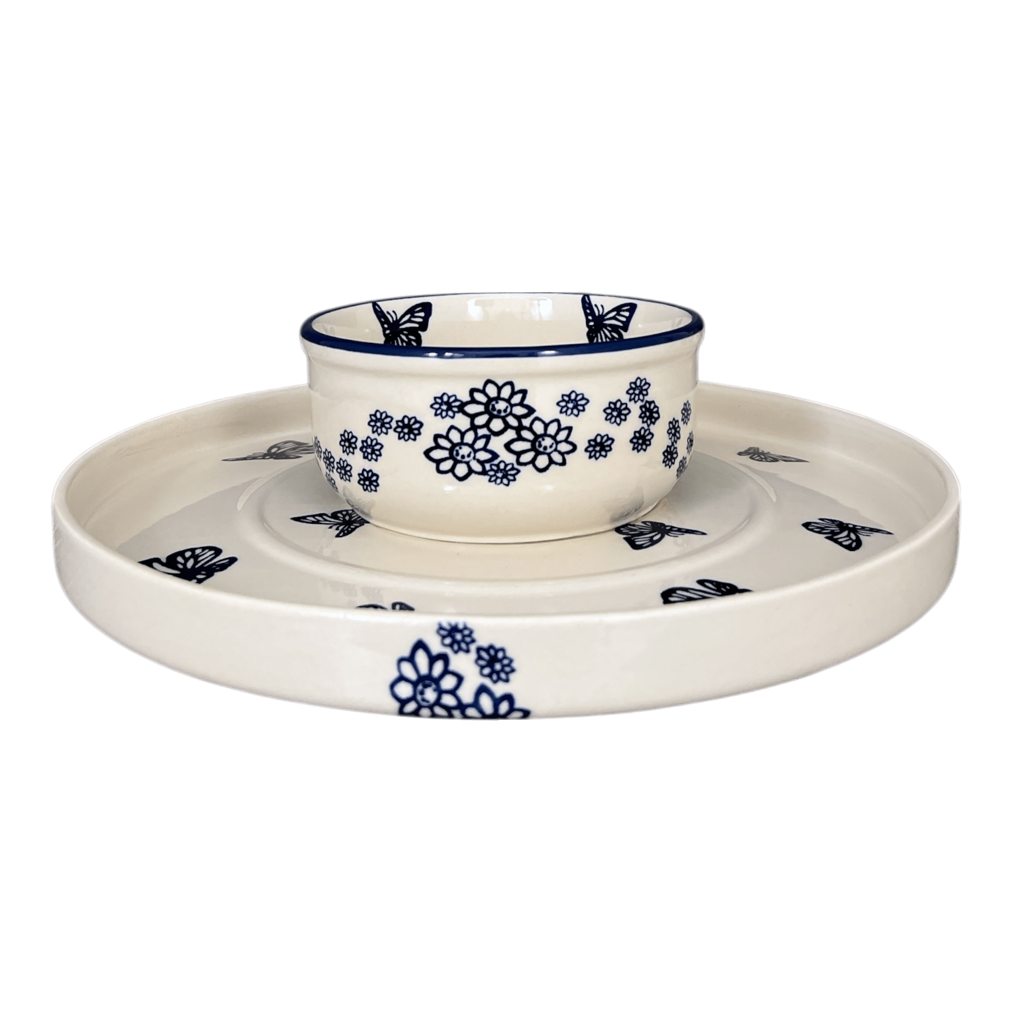 Imagine transforming your dining experience with a touch of enchantment from the lush meadows of Poland. Introducing the Polish Pottery Platter from Manufaktura, a masterwork that marries versatility with timeless elegance. This 12.75" round platter, adorned with the captivating "Butterfly Garden" pattern, is not just a dish but a portal to a whimsical world. Delicately painted butterflies flit among blue-outlined white flowers, set against a pristine white background, bringing the magic of a serene garden right to your table. Whether you're displaying a decadent cake or serving a selection of chips and dips, this platter flips over to become the centerpiece of your gathering, ensuring your culinary creations are framed in beauty.