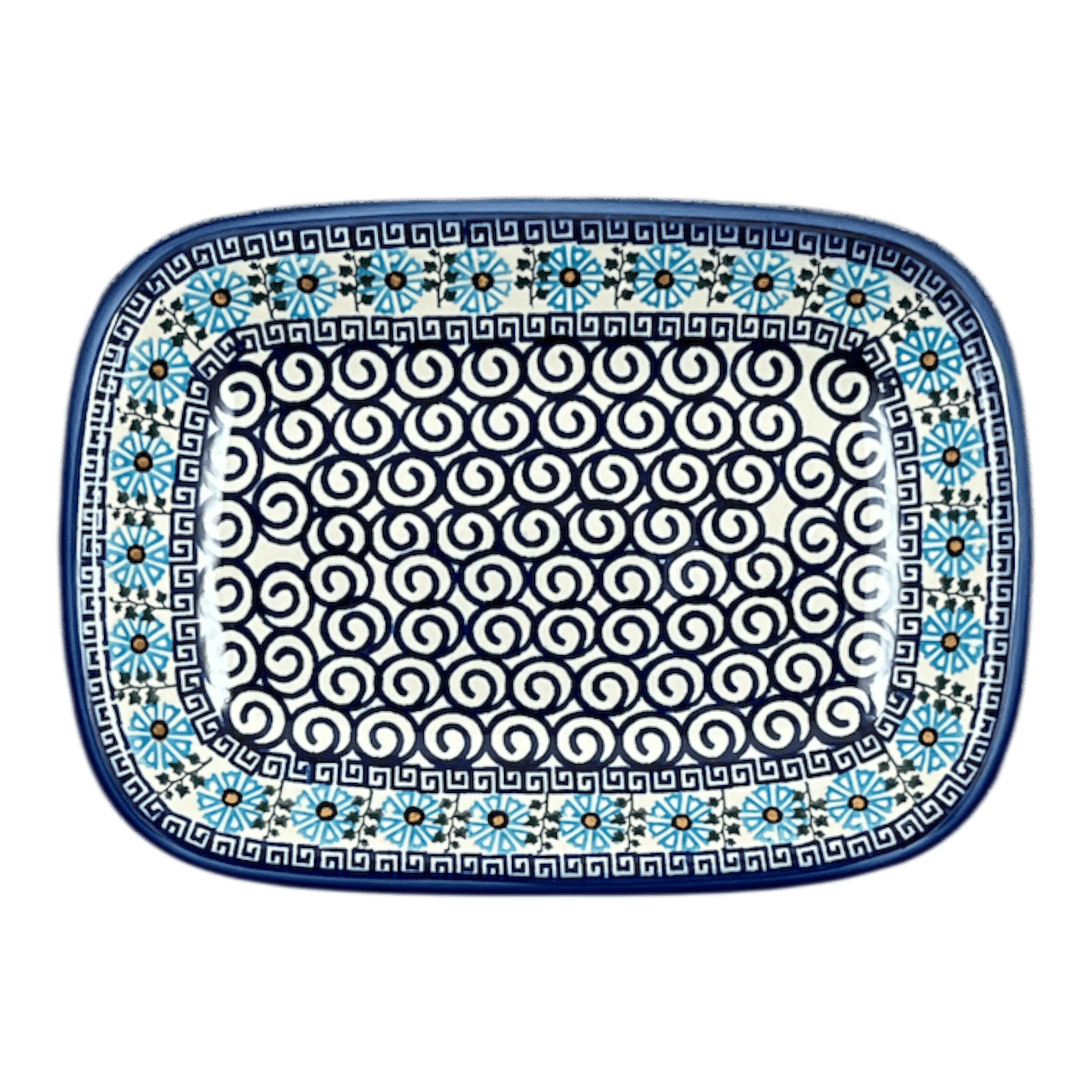 Steeped in tradition, yet bursting with a fresh modern flair, the "Blue Daisy Spiral" showcases the quintessential Polish pottery artistry. Employing the ancient "punching" technique, artisans hand stamp each design with a precision that speaks volumes of their dedication and skill. This method ensures that every tray has its own unique character, despite being part of the beloved Traditional pattern line—widely celebrated for its simplicity and boundless production. The durability of this piece is unmatched, crafted to withstand the rigors of daily use and safe for the dishwasher, microwave, and even your oven up to 425 degrees. It’s not just a tray; it’s a testament to enduring art and functionality.
