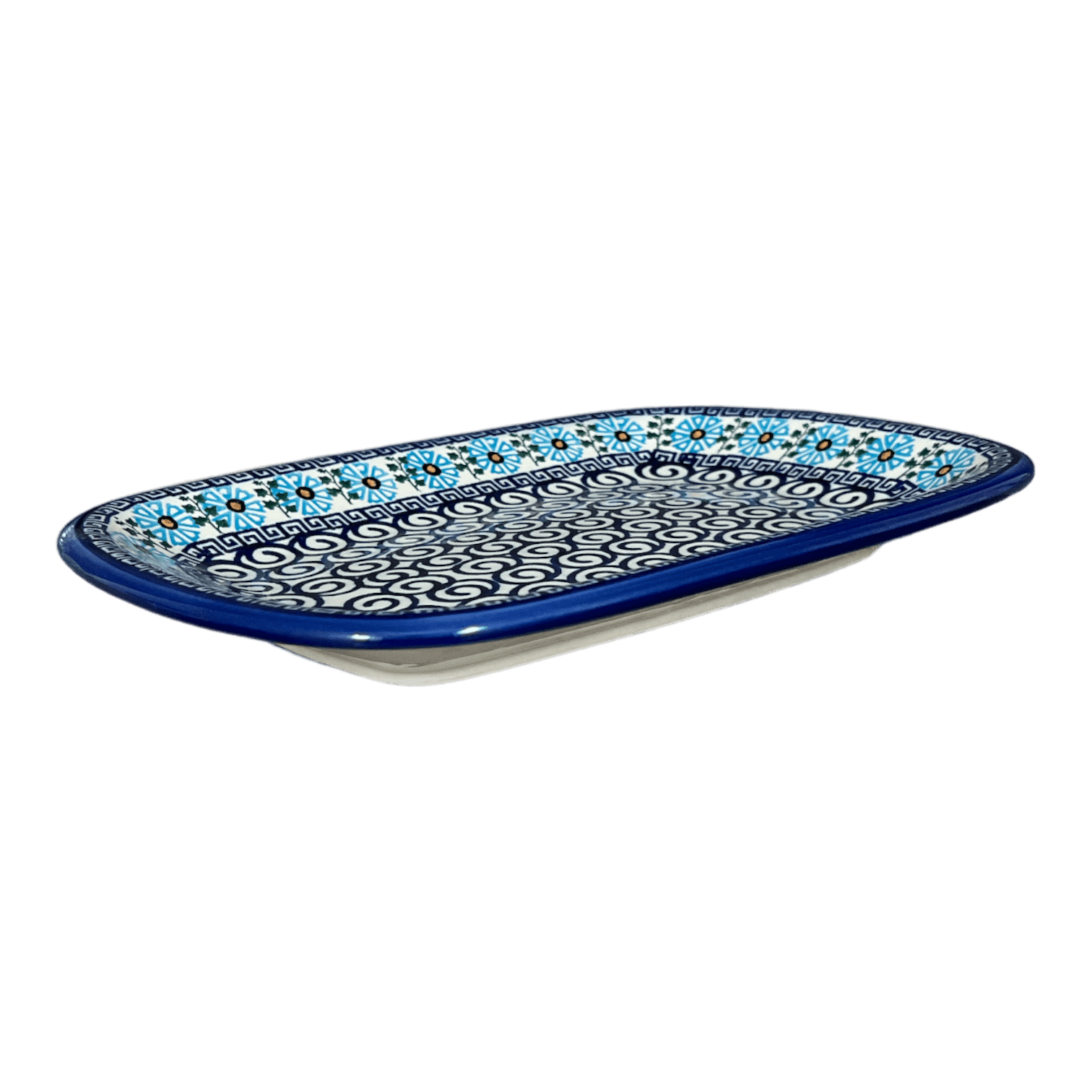 Imagine a tray that not only serves your favorite treats but also serves up a slice of artistic heritage! The Polish Pottery Tray, sized at a versatile 8" x 11", and lovingly crafted by the skilled hands of Andy in the picturesque town of Boleslawiec, Poland, is no ordinary kitchenware. This delightful piece is adorned with the charming "Blue Daisy Spiral" pattern, where light blue flowers dance around dark blue spirals, creating a visual feast that’s as captivating as the appetizers, desserts, and delectables you’ll place upon it. Whether it’s a quiet tea time or a lively dinner party, this tray promises to be the centerpiece, sparking conversations and admiration alike.