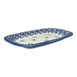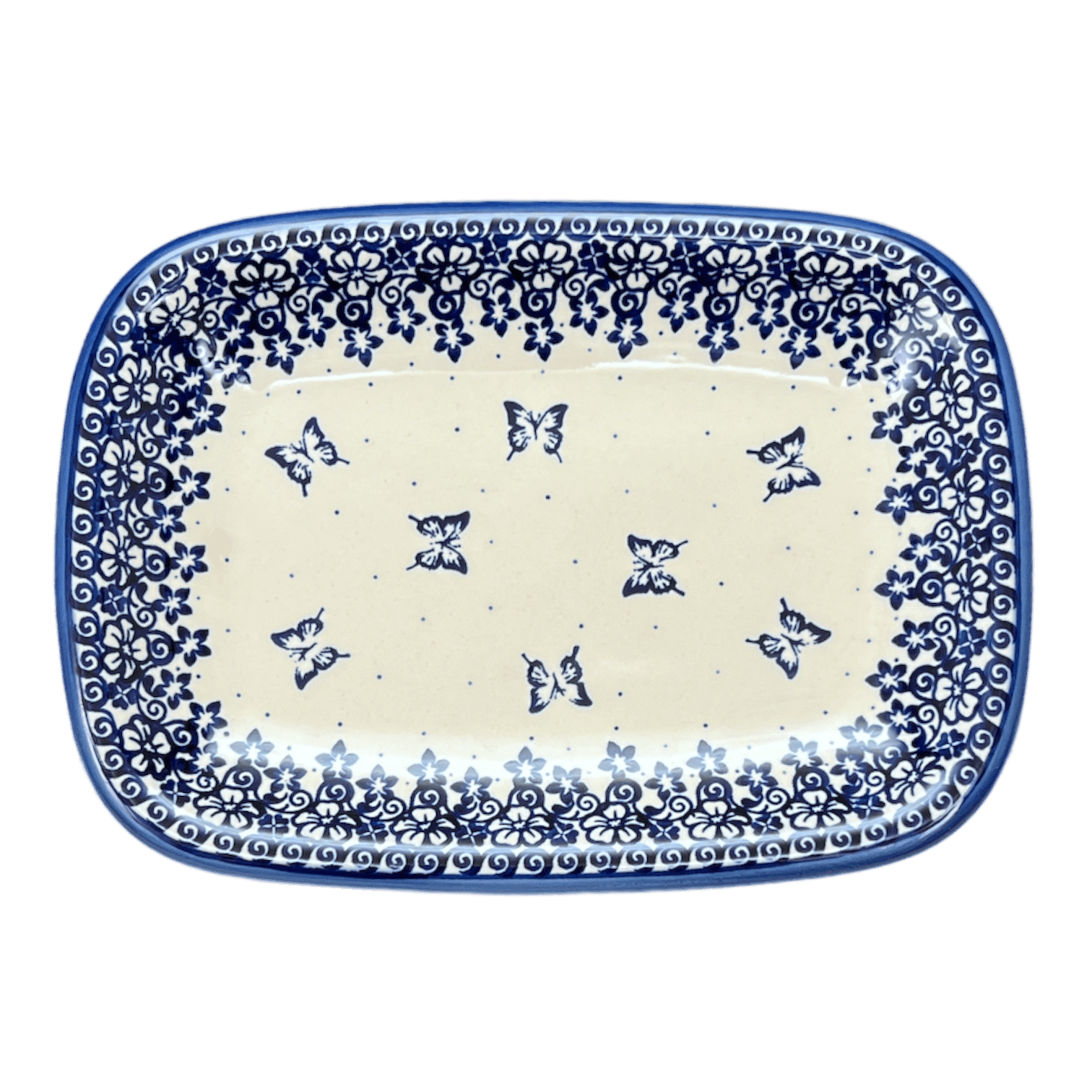 This exquisite tray, adorned with vibrant blue butterflies fluttering amidst white blooms, belongs to the Traditional category of Polish pottery. Such designs are celebrated for their timeless appeal and widespread recognition. Crafted using the ancient "punching" technique, this tray is a testament to the enduring legacy of Polish craftsmen who meticulously hand-stamp each design, inspired by the natural beauty that surrounds them. Although termed "simpler", these patterns are infinitely charming and offer a canvas where no two pieces are exactly alike—thanks to the individual flair of each artist.
