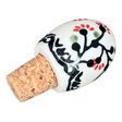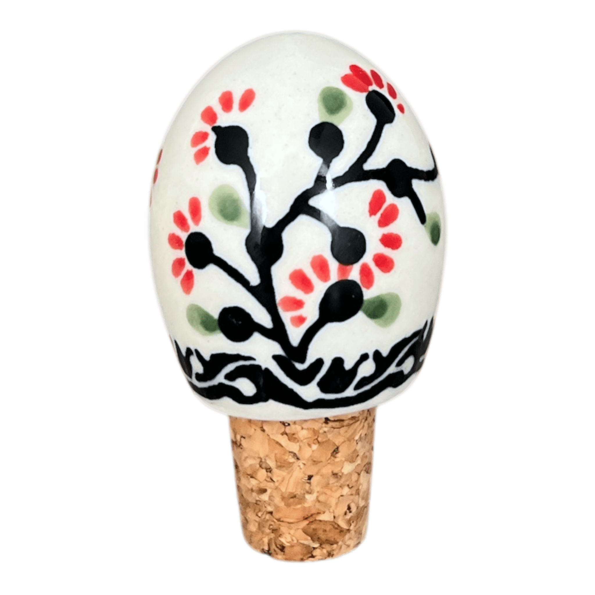 Imagine uncorking your favorite vintage, the aroma enticing your senses, and then resealing it with a flourish of artistry that is as intoxicating as the wine itself. This isn't just any wine cork; it's a Polish Pottery Wine Cork, meticulously crafted by the artisans at Manufaktura. Shaped like a charming egg and standing at a petite 2.75 inches, this cork isn’t just functional—it's a miniature masterpiece. Adorned with the vibrant "Cherry Blossoms" pattern, it features whimsical black vines and vivid red blossoms dancing across a pristine white background, bordered by a playful green dotted rim.