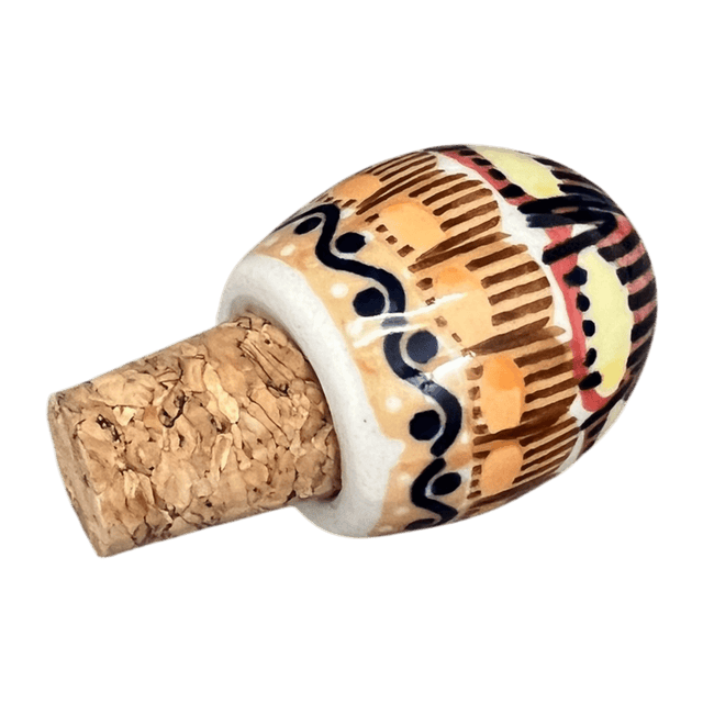 Imagine capping off your favorite bottle of wine with a splash of artistic brilliance! Introducing the Polish Pottery Wine Cork, shaped like a charming egg and standing at a quaint 2.75 inches. This unique piece is crafted by the skilled artisans of Manufaktura in the vibrant "Desert Sunrise" pattern, part of their exclusive Unikat collection. Picture the early morning desert sky, captured on your tabletop—the base of this exquisite pattern features an orange background with tiny, densely packed brown dots, encircled by a radiant band of yellow suns with blue rays, and a smaller inner band of orange suns with brown rays. This isn't just a wine cork; it's a miniature masterpiece that tells a story of dawn breaking across the horizon.