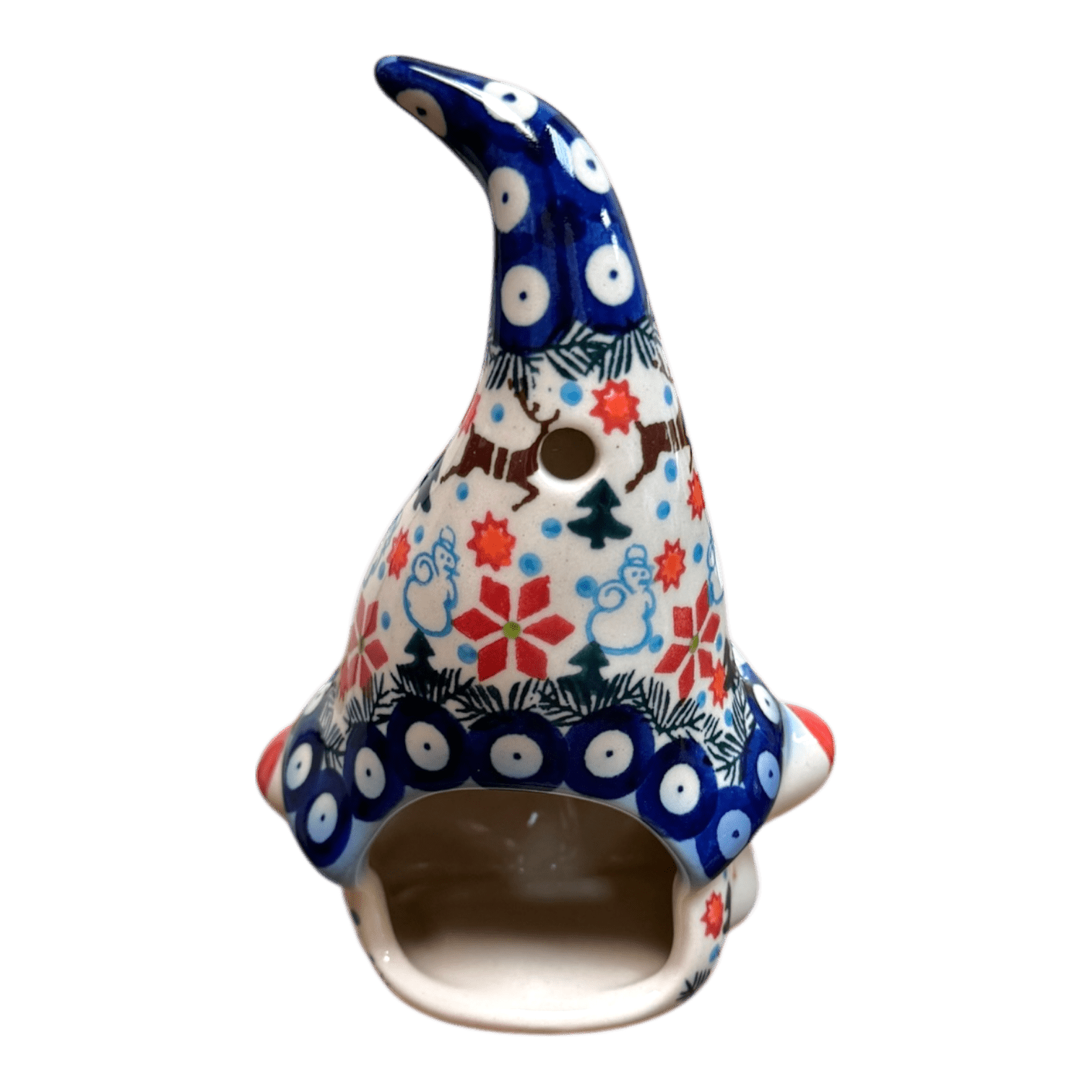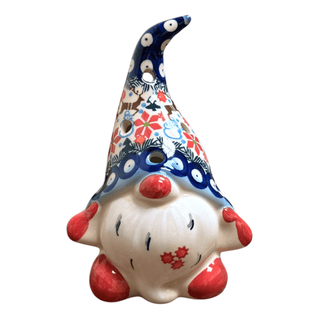 Introducing the enchanting Polish Pottery Luminary Gnome, standing a charming 6.5 inches tall. This delightful gnome, crafted by the renowned artisans at Galia in the captivating "Winter Garden" pattern, is not just any gnome. It features a secret hollow base designed to house a tealight, bringing the magic of twinkling light to any corner of your room. Imagine the serene glow, illuminating the intricate snowflakes and flowers painted in a palette of deep blues, vibrant reds, lush greens, and pristine whites. This gnome promises to bring not just light but a dash of whimsy and wonder to your living space.