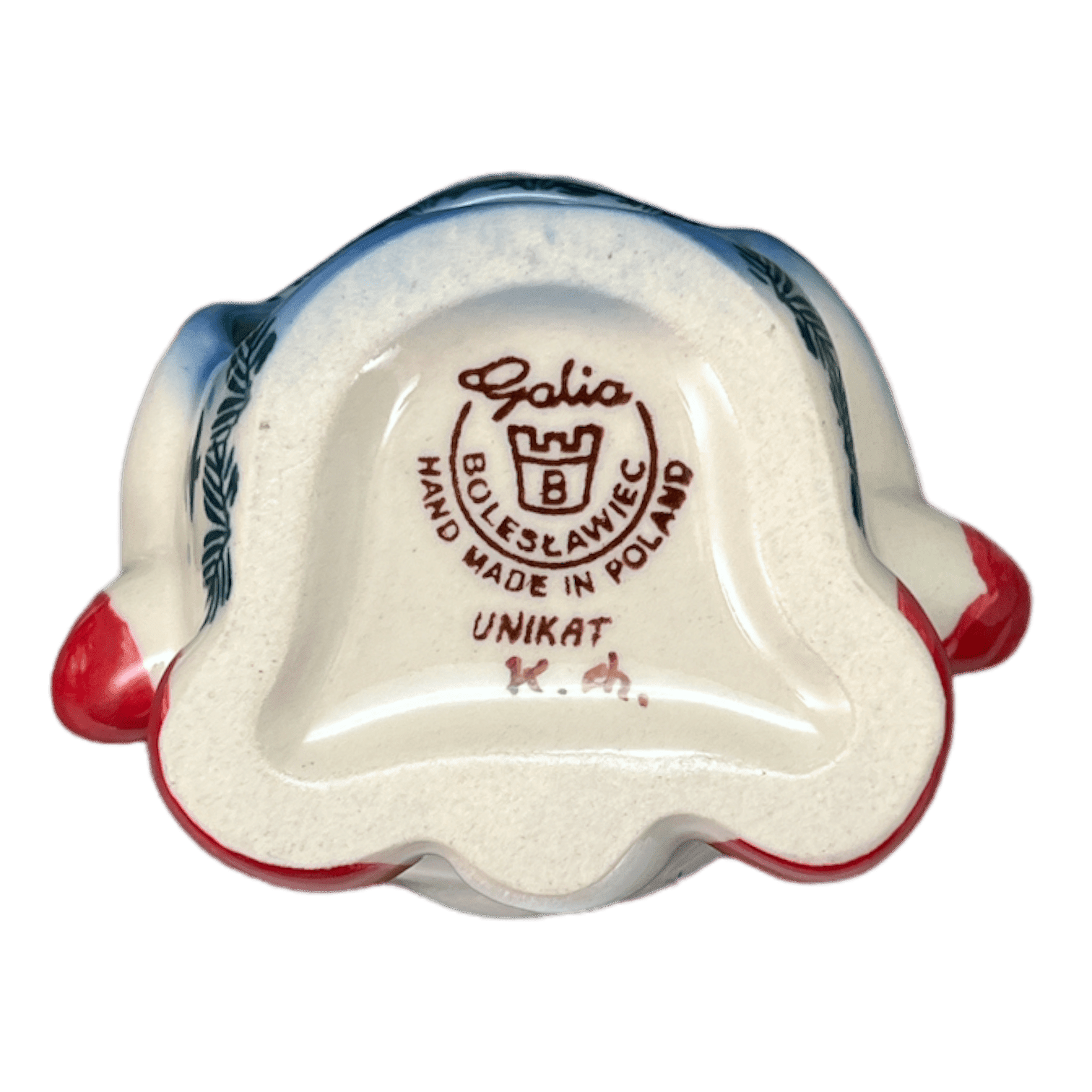 Each gnome is a canvas displaying the breathtaking "Winter Garden" pattern, adorned with large red poinsettias, friendly snowmen, graceful reindeer, and stoic pine trees. This tableau is framed beautifully by a border of cobalt blue dots. But what truly sets this piece apart is its Unikat status, signifying a level of craftsmanship that transcends the ordinary. Unikat, meaning 'unique' in Polish, represents a pinnacle of artistic achievement recognized by a special stamp on each piece. These creations are the result of painstaking labor and creativity, painted by a select group of artists whose skills have soared to extraordinary heights, making each gnome a masterpiece of color and joy.