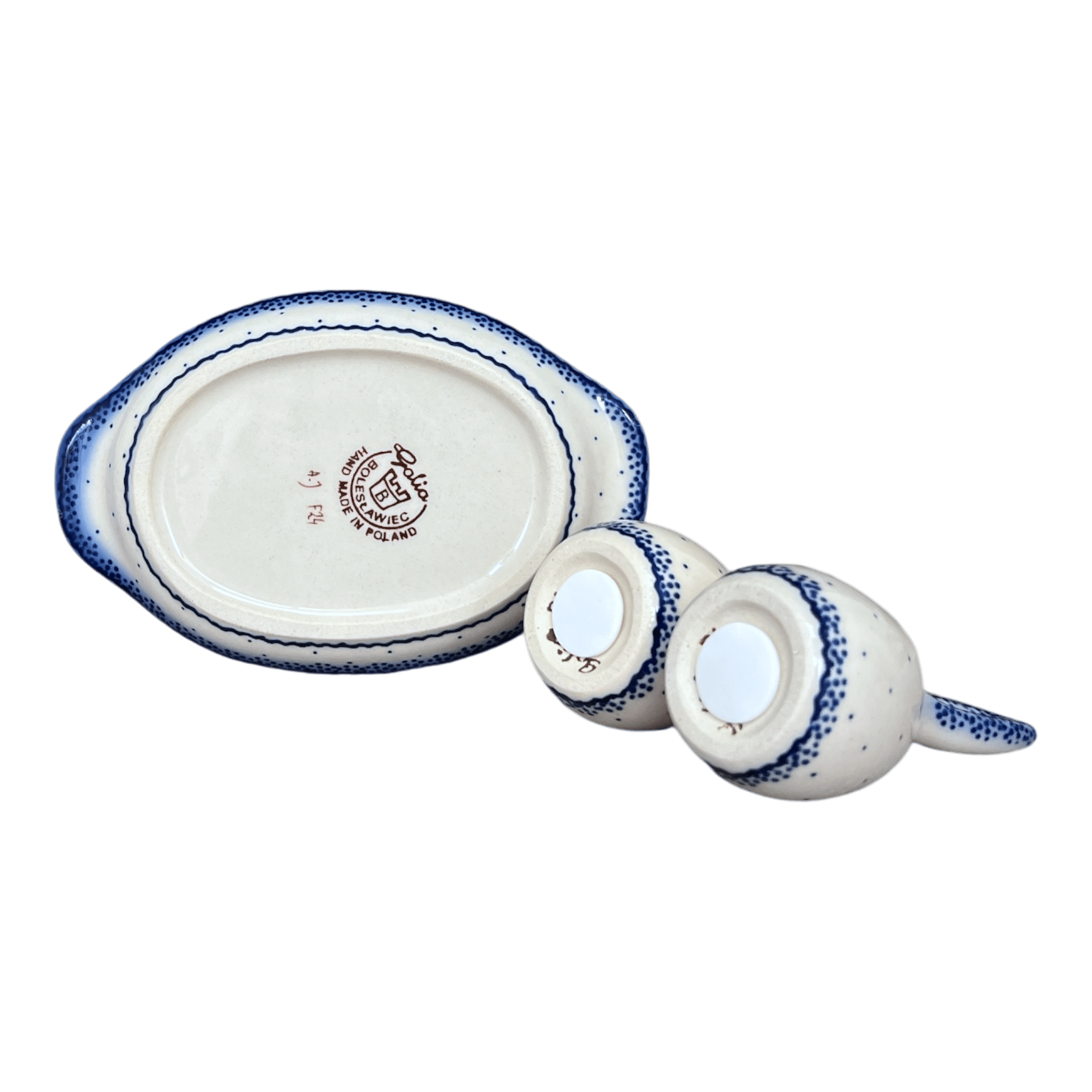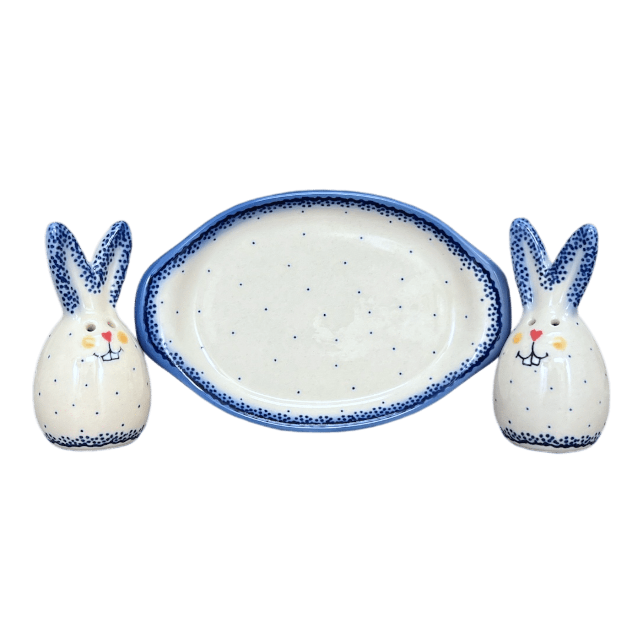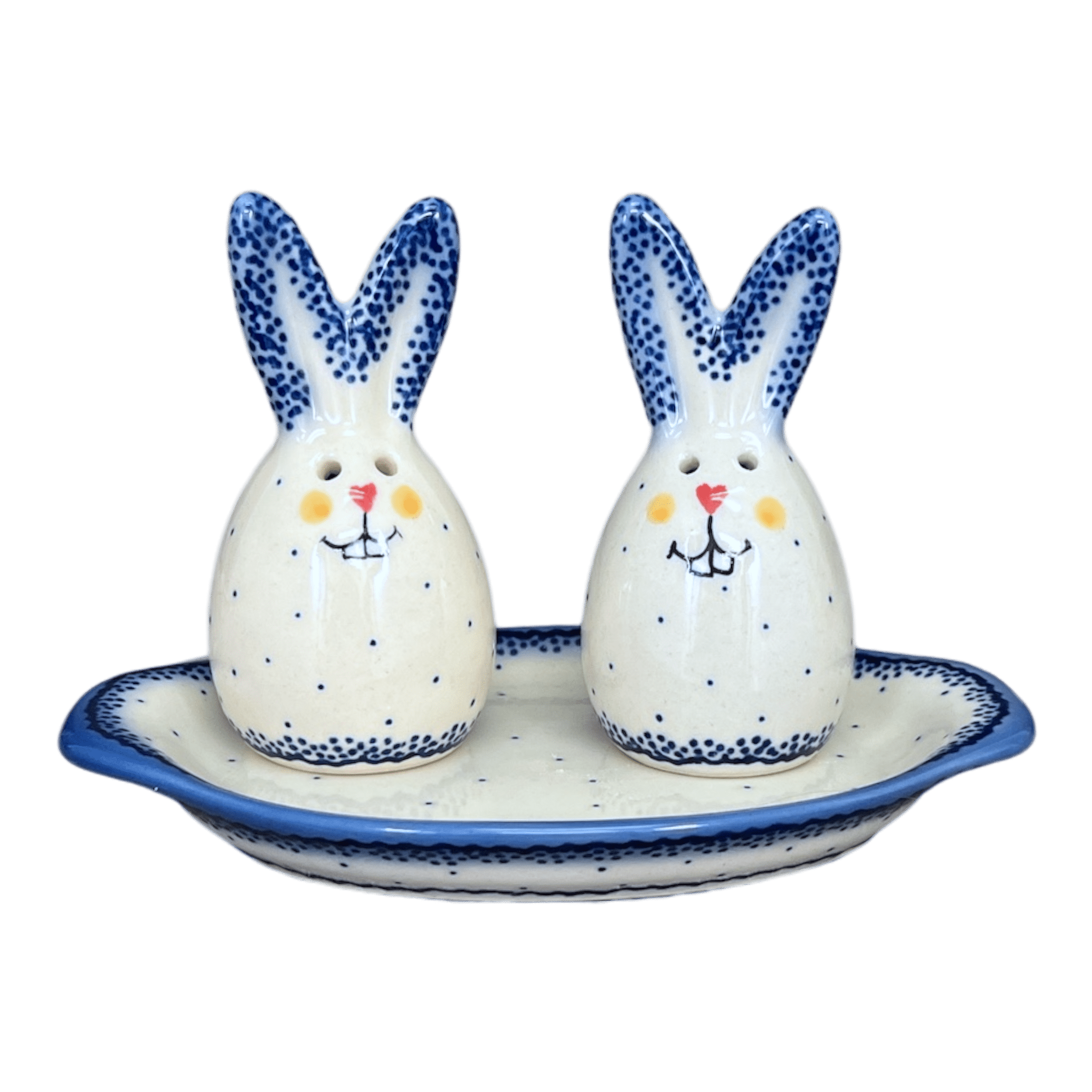 Step into a world of enchanting table decor with the Polish Pottery Shaker set, shaped like adorable bunnies, that promises to sprinkle a dash of charm alongside your spices! Crafted by the skilled artisans at Galia, these 4.3-inch shakers showcase the delightful "Blue Speckled" pattern, featuring whimsical dots sprinkled across a vibrant cobalt blue canvas. Perfect for both everyday use and special occasions, these bunny shakers add a touch of whimsy and a pop of color to any meal, making each dining experience uniquely enjoyable.