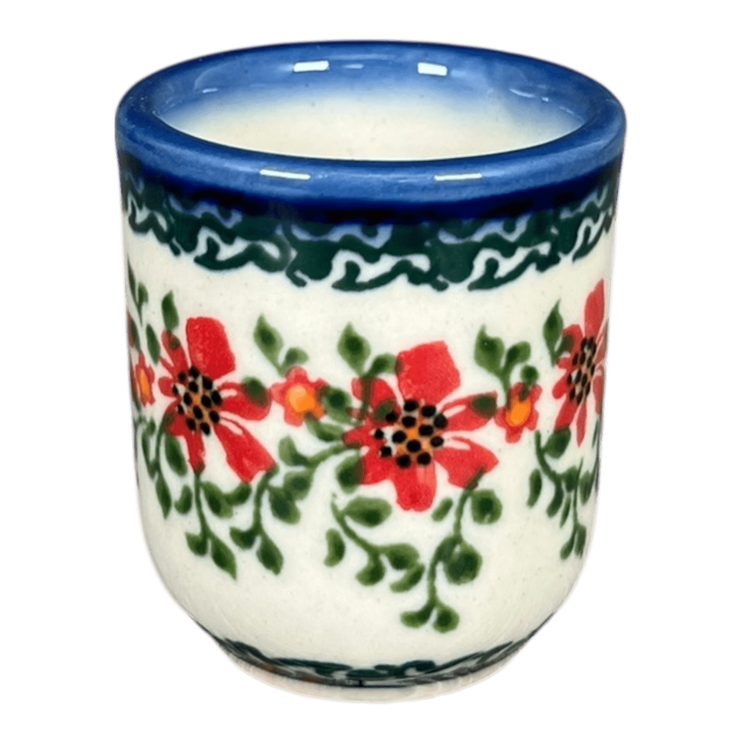 Cheers to the charming allure of the Galia Polish Pottery Drinking Glass! Holding a cozy 3 oz, this delightful piece doubles wonderfully as a shot glass or an inventive toothpick holder. Crafted in the picturesque town of Boleslawiec, Poland, this tiny treasure is adorned with the enchanting "Draping Red Florals" pattern. Vivid red blossoms and green leafy vines gracefully dance across the surface, bordered by a serene green vine and a striking solid blue rim. This traditional pattern, achieved through the meticulous "punching" technique of hand stamping, showcases the quintessential artistry that Polish pottery is renowned for.