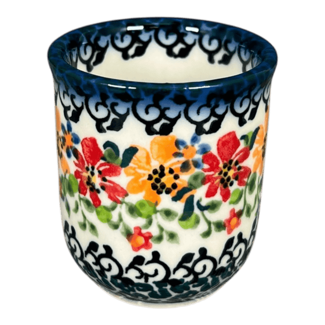 Introducing the enchanting Polish Pottery Drinking Glass, Shot, 3 oz, from Galia's exclusive "Red & Orange Dream" collection. Immerse yourself in a vibrant spectacle of colors with each shot glass, showcasing a dance of large orange and red flowers twirling around green vines, punctuated by playful small blue blossoms set against a pristine white backdrop. This exquisite piece isn't just a drinking accessory; it's a miniature work of art. Celebrated for its Unikat pattern—meaning "Unique" in Polish—this design celebrates the pinnacle of pottery artistry, crafted with an intricate array of colors and details that only the most skilled artisans of Boleslawiec, Poland, can achieve.