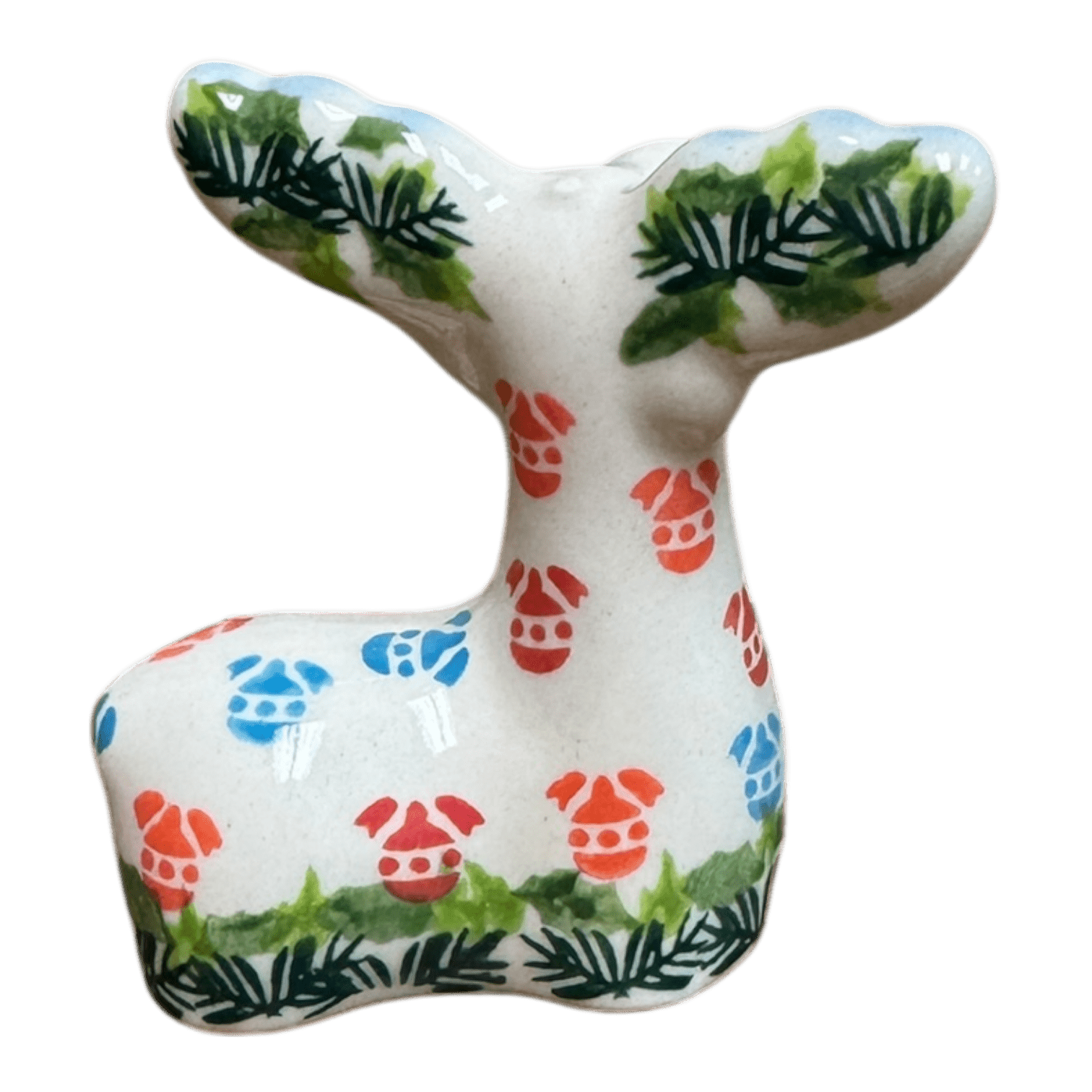 The "Colorful Baubles" pattern is a traditional masterpiece, featuring red, blue, and orange ornaments intertwined with green garland borders and a striking cobalt blue rim. Crafted using the age-old "punching" technique, where skilled artists meticulously hand-stamp each design, this pattern echoes the rich heritage and artistic legacy of Polish pottery. Though traditional in technique, each piece is unique, reflecting the individual artistry and the natural variations that arise from handcrafting. This makes your adorable reindeer not just a decoration, but a piece of art with its own distinct character and story.