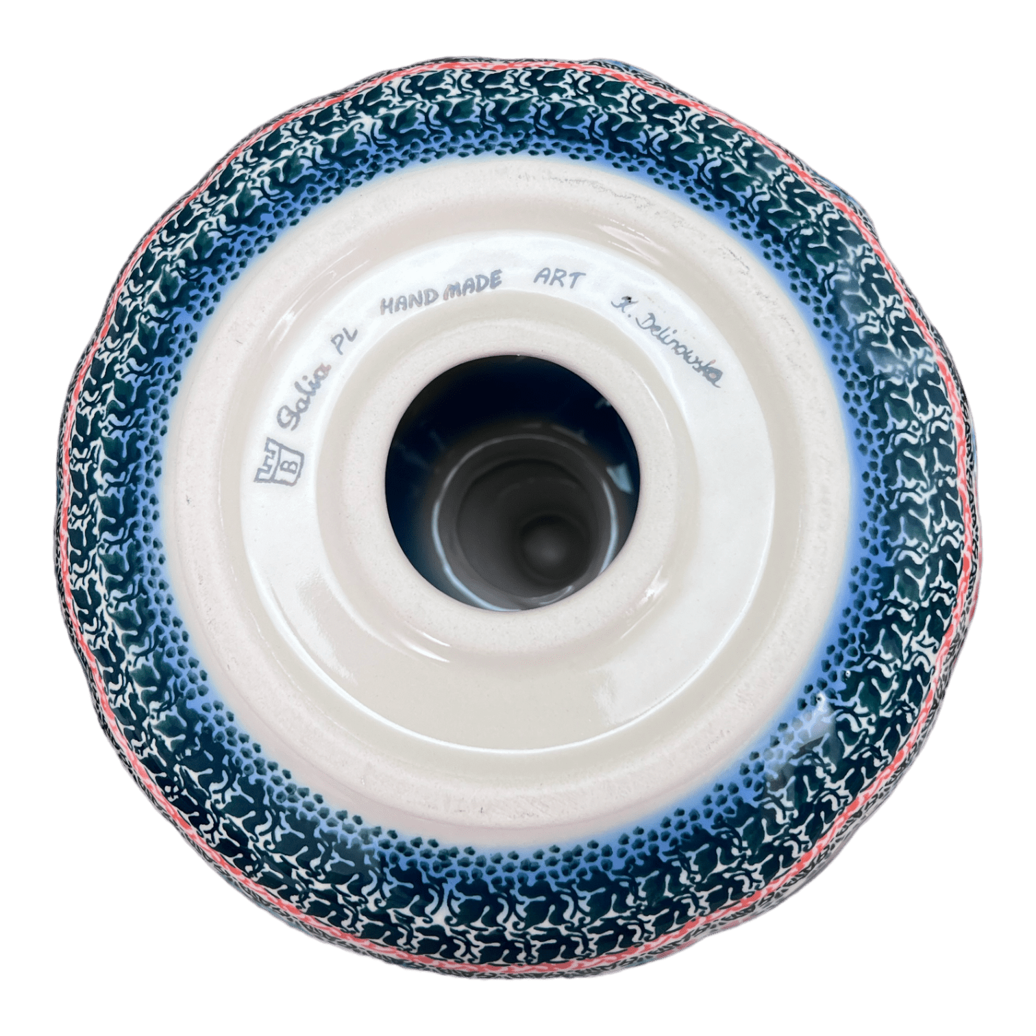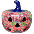 Illuminate your Halloween with a touch of enchanting folklore! Introducing the Polish Pottery Luminary Jack-O-Lantern, crafted by the esteemed artisans at Galia. This charming 8-inch luminary, adorned in the vibrant "Maroon Daisy" pattern, is a bewitching addition to your festive decor. Simply nestle a tealight (whether flickering flame or a safe, battery-operated light) beneath its hand-painted curves and watch as a spooky yet delightful glow emanates, casting magical shadows that dance across your walls. The lively design features a symphony of maroon and pink daisies sprawling across a lush background of green leaves, punctuated by petite blue flowers and framed by a spirited green and orange border.