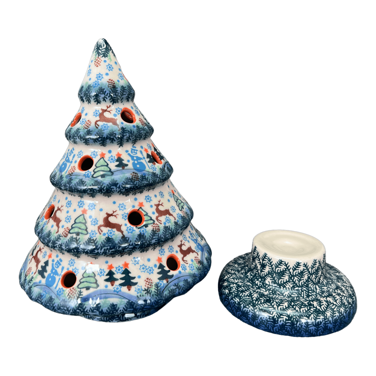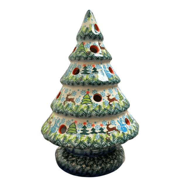 Step into the enchanting world of Polish pottery with the stunning 10" Large Polish Pottery Luminary in the whimsical "Reindeer Dance" pattern by Galia. This beautifully crafted Christmas tree luminary is more than just a decoration; it's a gateway to a magical holiday ambiance. Picture this: a chilly winter evening, a cup of hot cocoa in hand, and the gentle glow of this charming luminary lighting up the room with a soft, warm light. The intricate "Reindeer Dance" pattern dances around the luminary, featuring joyful reindeer, playful snowmen, and serene pine trees, all set against a crisp white background speckled with blue snowflakes and framed by a green pine needle border.
