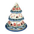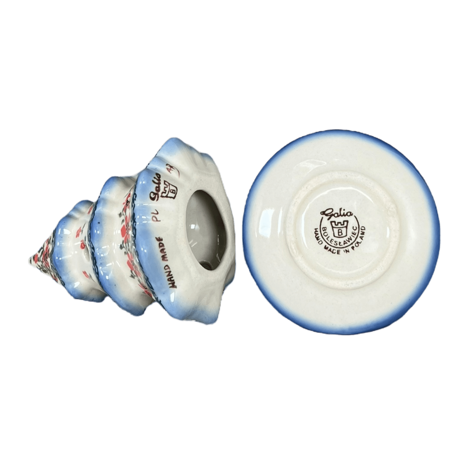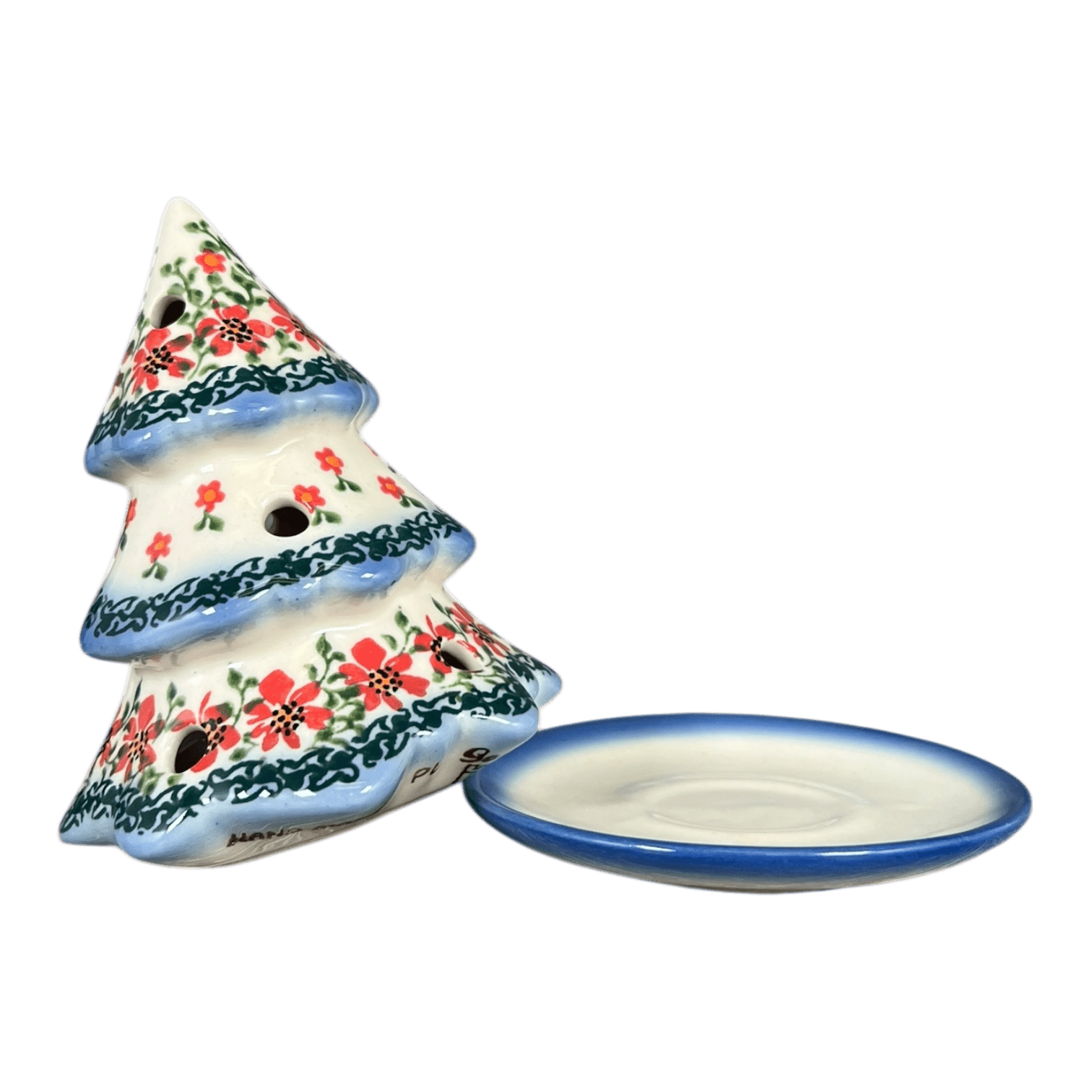Illuminate your festive season with the enchanting Polish Pottery Luminary, a Christmas Tree masterpiece from Galia. This 5" small treasure, adorned in the vibrant "Draping Red Florals" pattern, transforms any room into a cozy holiday haven. Just place your choice of a tealight—be it flickering flame or a safe, battery-operated light—on its sturdy base, cap it with the ceramic tree, and watch as mesmerizing lights dance across your walls. The pattern boasts a lively display of red blooms entwined with green leaves, bordered by a lush green vine and framed with a solid blue rim, bringing a burst of color and warmth to your holiday decor.