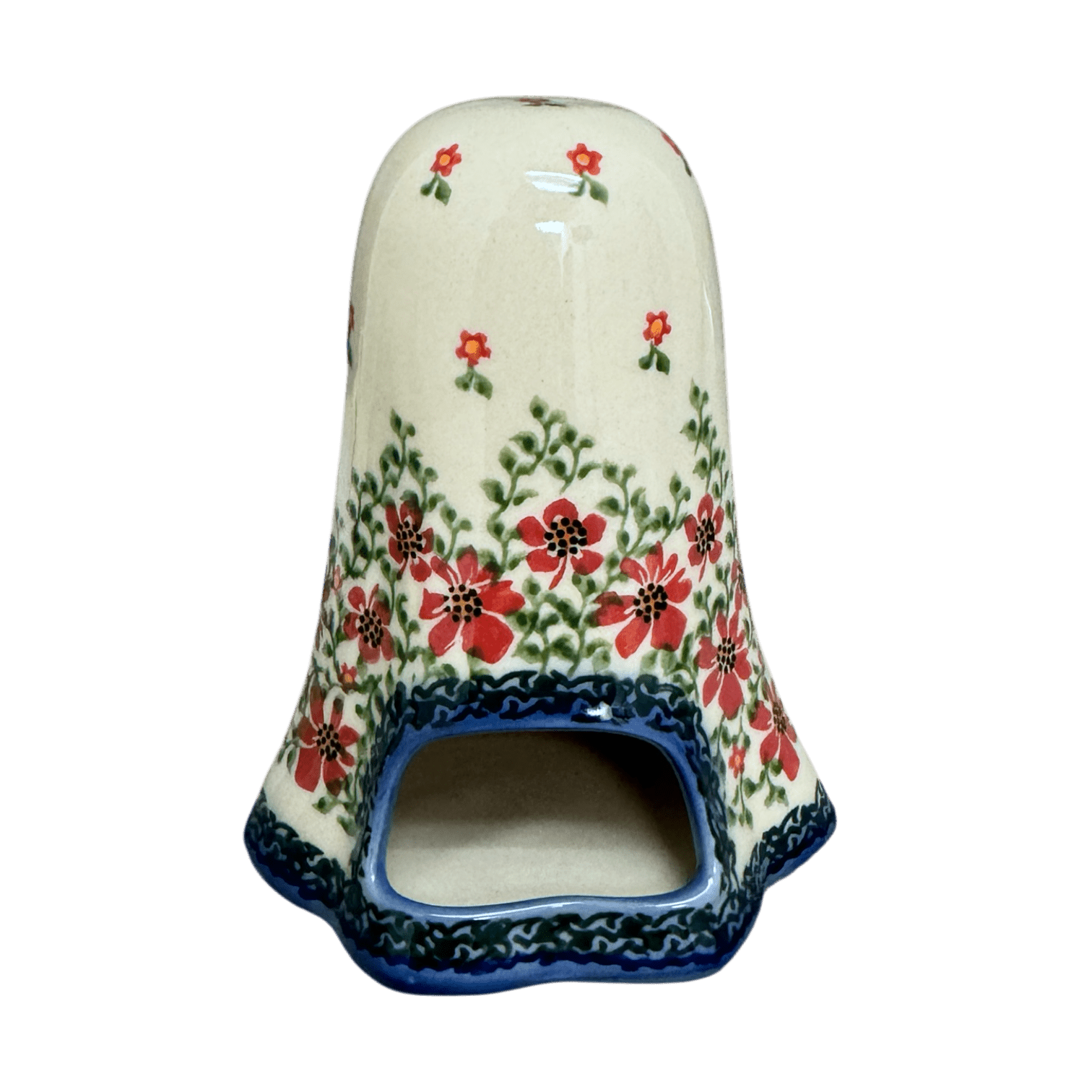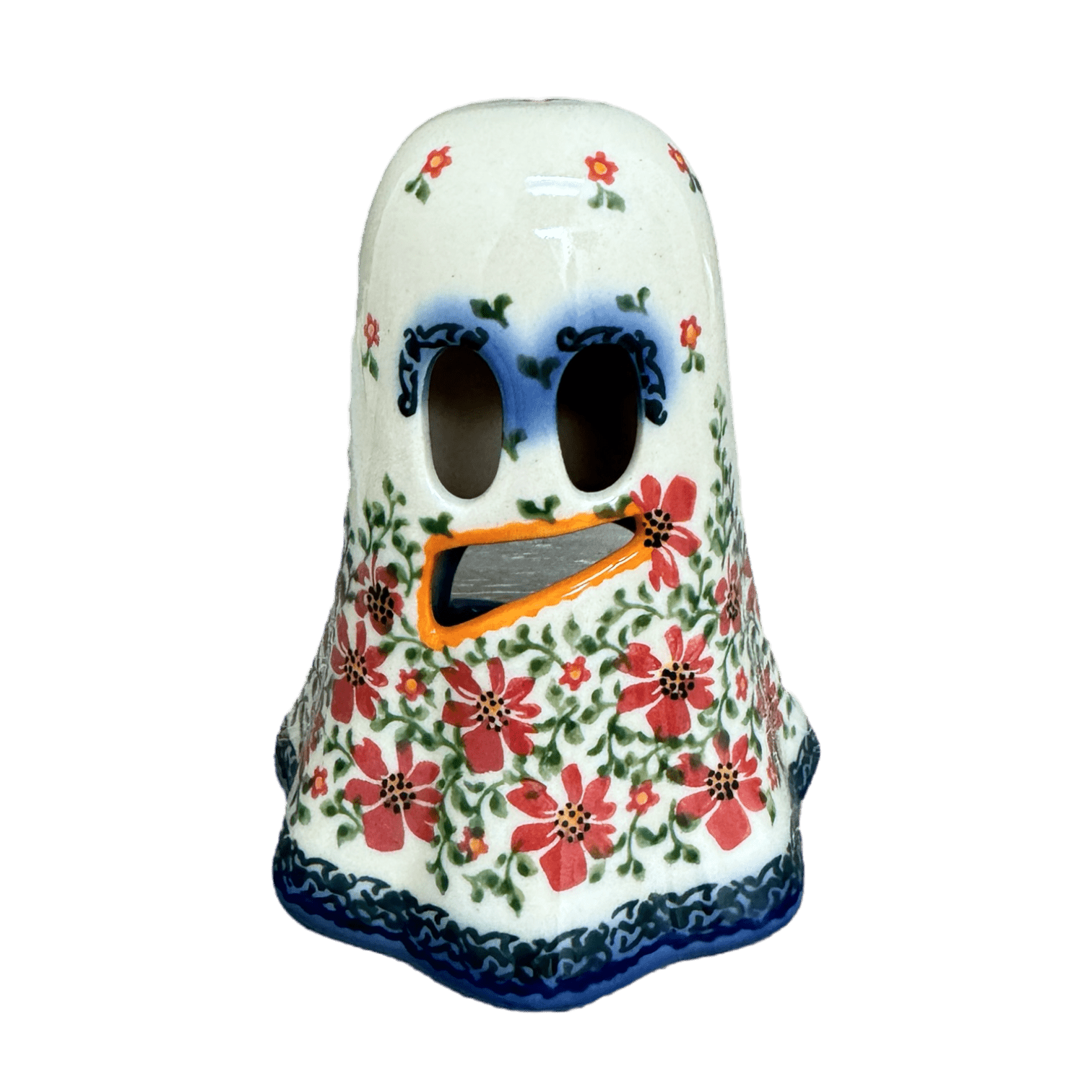 Step into a world where traditional artistry meets the whimsical charm of Halloween with the Polish Pottery Luminary Ghost by Galia! This delightful piece stands at a quaint 5.25 inches and is beautifully adorned in the "Draping Red Florals" pattern. Picture this: a playful ghost casting a warm, inviting glow in your home as you place a tealight inside—be it a flickering real flame or a safe, battery-operated light. As the light dances within, watch the vibrant red flowers and lush green leaves come to life, casting enchanting shadows that set the perfect spooky ambiance for your Halloween festivities!