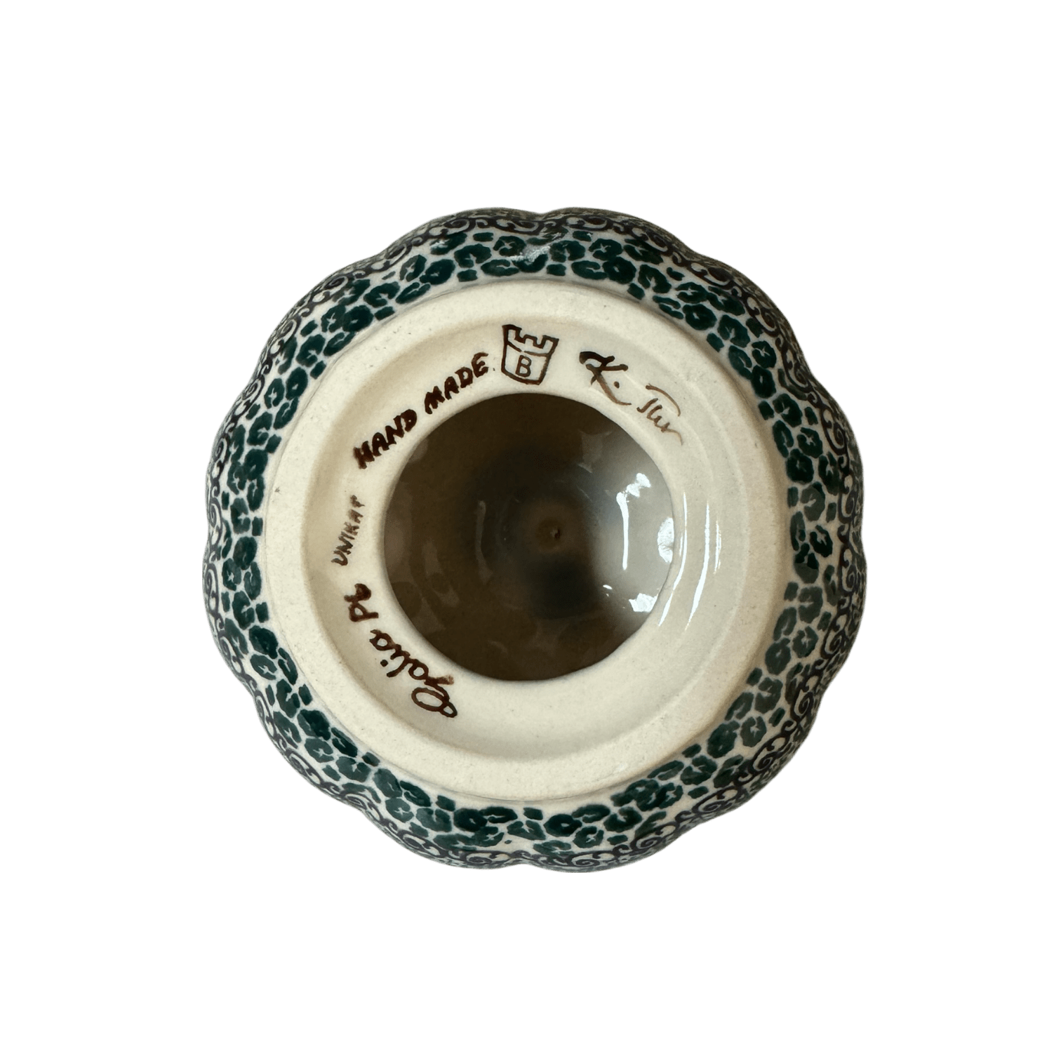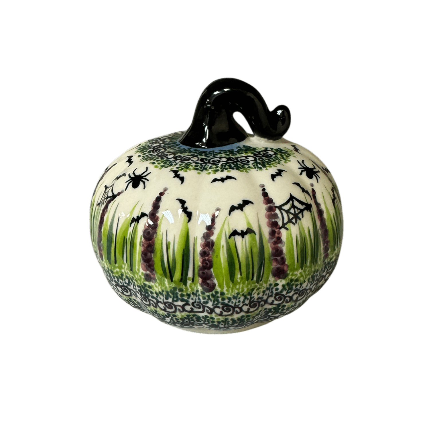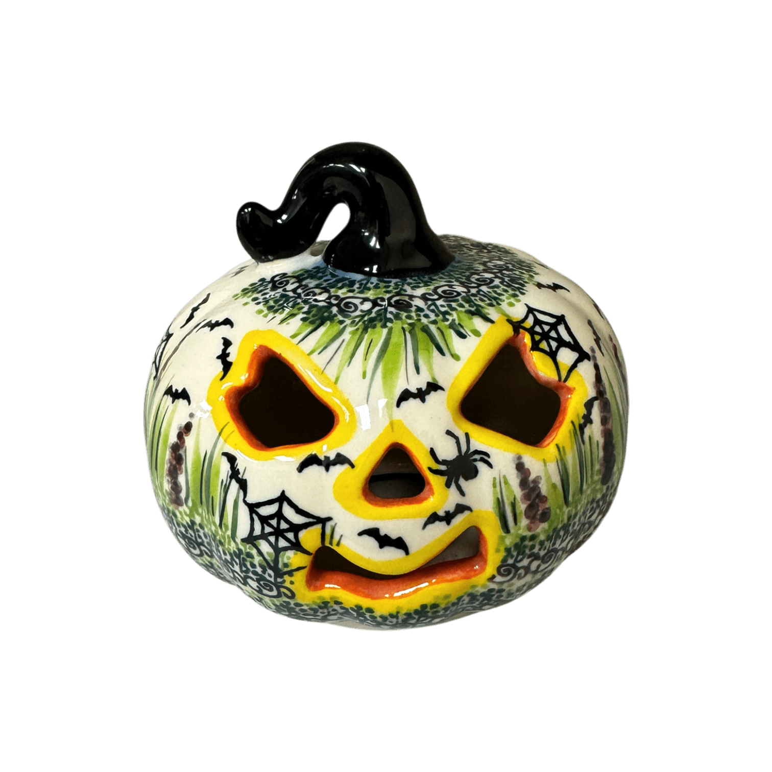 Step into the enchanting world of Halloween with the delightful Polish Pottery Luminary, a Pumpkin-shaped marvel from Galia's exclusive "Spooky Field" collection. Imagine a quaint Jack-O-Lantern, not just any Jack-O-Lantern, but one adorned in a tapestry of neon green grass, dark purple flowers, and a whimsical assortment of bats, spiders, and cobwebs, all set against a stark white backdrop. Light up your evenings by placing a tealight inside—be it a flickering flame or a battery-operated beacon—and bask in the mysterious glow that dances across the room, bringing the magic of All Hallows' Eve right into your home.