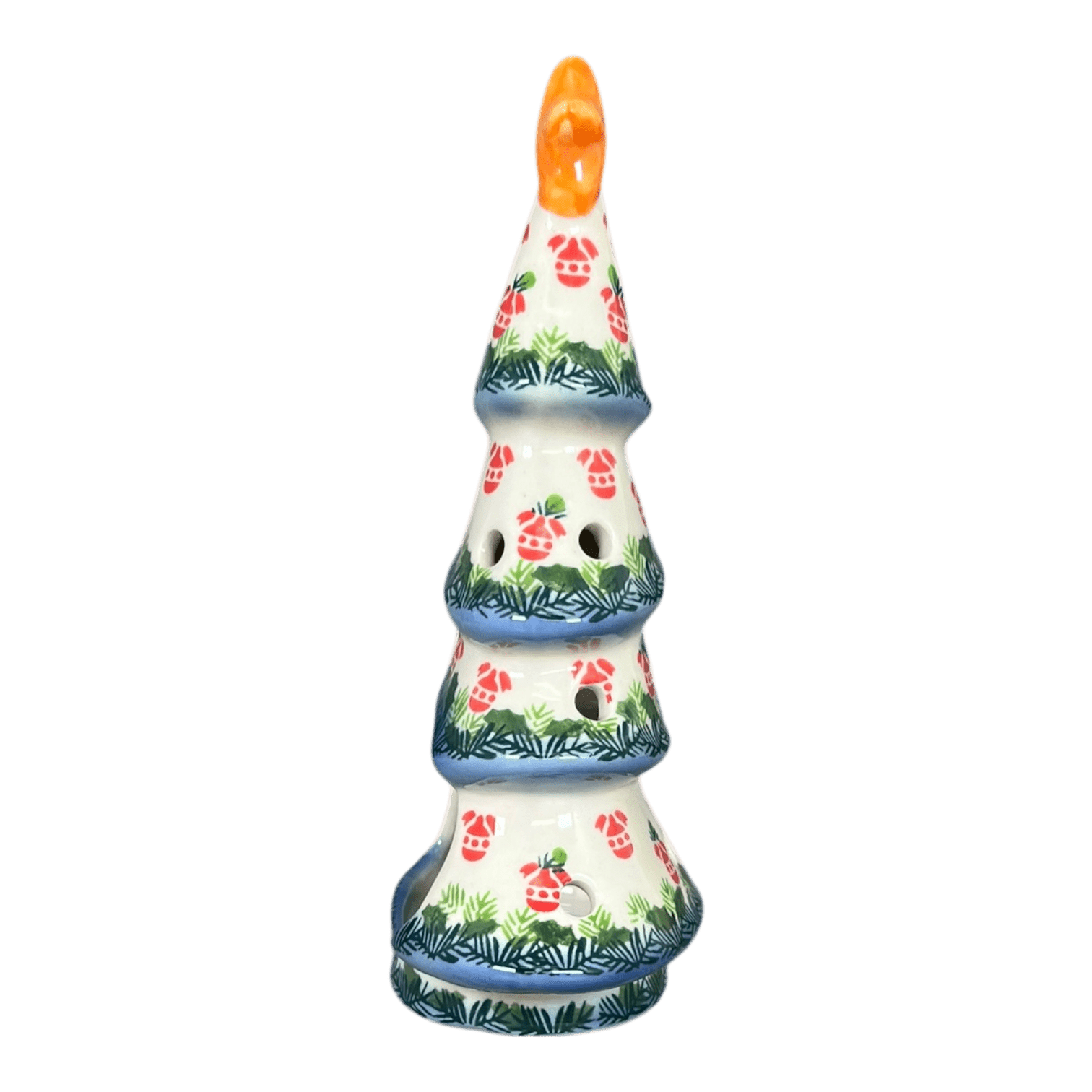 Step into the festive spirit with the enchanting Polish Pottery Luminary, a Skinny Christmas Tree standing at a charming 7.5 inches tall. Crafted with care by the skilled artisans of Galia in the picturesque town of Boleslawiec, Poland, this delightful piece shines brightly in the "Evergreen Baubles" pattern. Picture this: a traditional scene of vibrant red ornaments and lush green garland, all beautifully bordered with a striking cobalt blue rim. Each luminary is a unique celebration of the season, designed to bring a warm, inviting glow to your holiday decor.