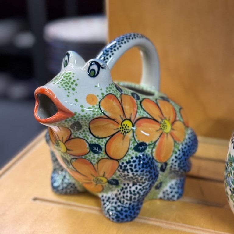 Made with love and painstaking attention to detail in the historic town of Boleslawiec, Poland, this Polish Pottery piece stands out for its durability and functional beauty. Measuring 6.75 inches tall, 7 inches long, and 6 inches wide, and boasting a generous 40 oz. capacity, it is crafted from high-quality materials that are tough, chip-resistant, and free of harmful substances like lead, nickel, and cadmium. Whether used for watering your favorite blooms or serving refreshments in style, this froggy pitcher is sure to be a conversation starter. Mix and match it with other Polish Pottery pieces to create a stunning tableau that reflects the joyful spirit of the changing seasons.
