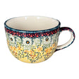 Introducing the Polish Pottery Large Latte/Soup Cups by Manufaktura in the vibrant "Sunshine Grotto" pattern (WK52). These wide mugs are not only practical for soups, chilis, coffees, and teas, but they also add a touch of sunshine to your day! With a predominantly yellow color adorned with accents of green and red, this pattern is sure to brighten up any kitchen.