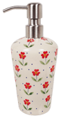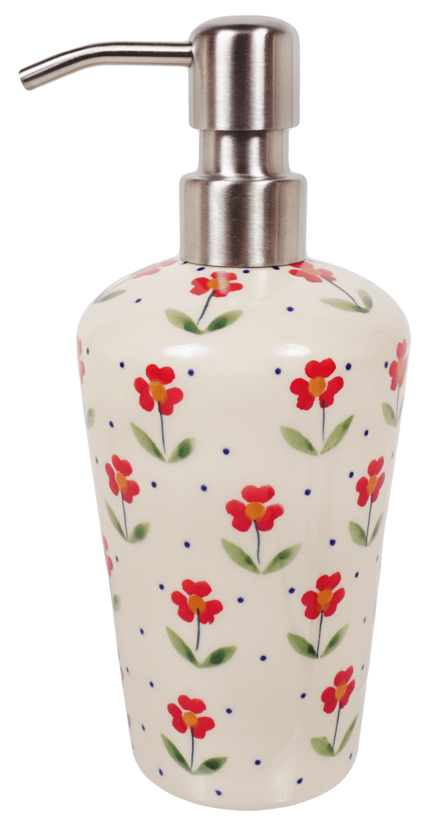 Introducing the Polish Pottery Soap Dispenser from Manufaktura, a stunning piece of craftsmanship that transforms any ordinary sink into a work of art! Standing at a proud 7 inches and adorned in the enchanting "Simply Beautiful" pattern, this dispenser does more than just hold soap—it tells a story. Each piece, hand-painted in the heart of Boleslawiec, Poland, features a delightful array of red flowers, sprouting thin stems and petite green leaves, accented by playful blue dots scattered throughout. This design, a traditional Polish pottery pattern, not only adds a burst of color but brings a piece of Polish heritage right into your home.