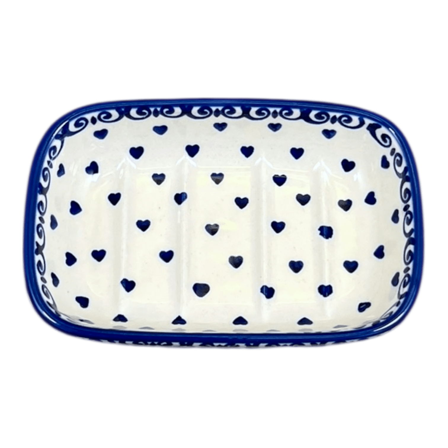 Imagine a charming addition to your home that combines tradition with a touch of whimsy - the Polish Pottery Soap Dish from Manufaktura! This delightful piece, measuring 5" x 3.25", is more than just a soap dish; it's a miniature work of art. Handcrafted in the quaint town of Boleslawiec, Poland, this dish features the captivating "Heartfelt Blue" pattern. Envision cobalt blue hearts playfully swirling around a crisp white background, each ridge inside the dish thoughtfully designed to keep your soap securely in place. Whether by your bathroom sink or cradling a sponge in the kitchen, this dish brings a splash of color and charm to any space.