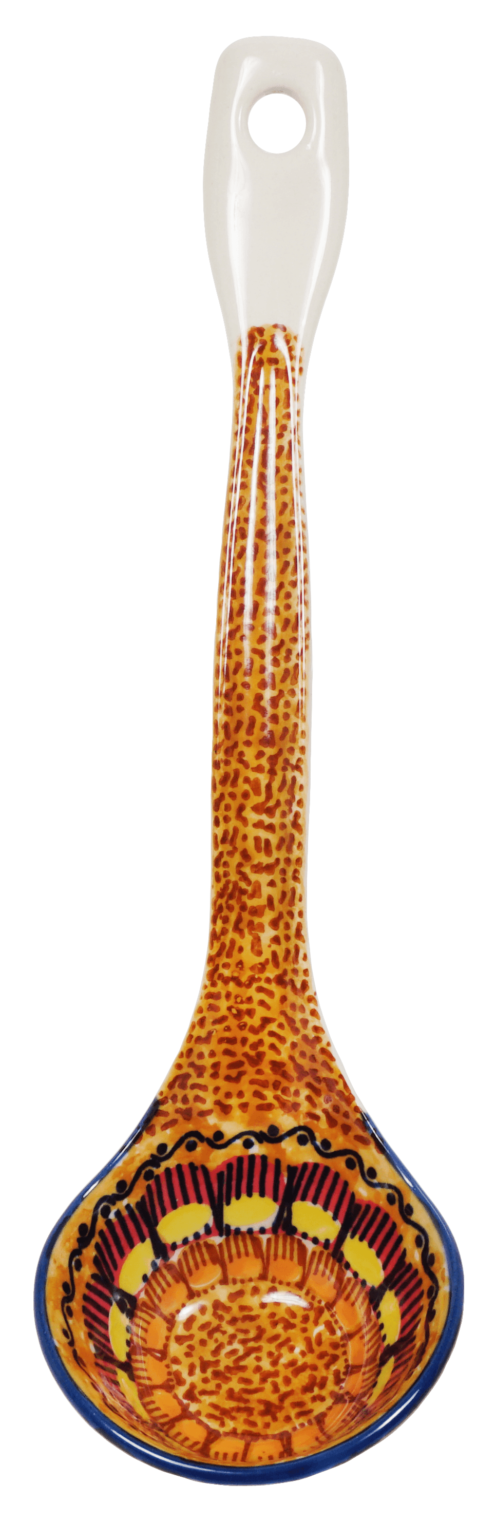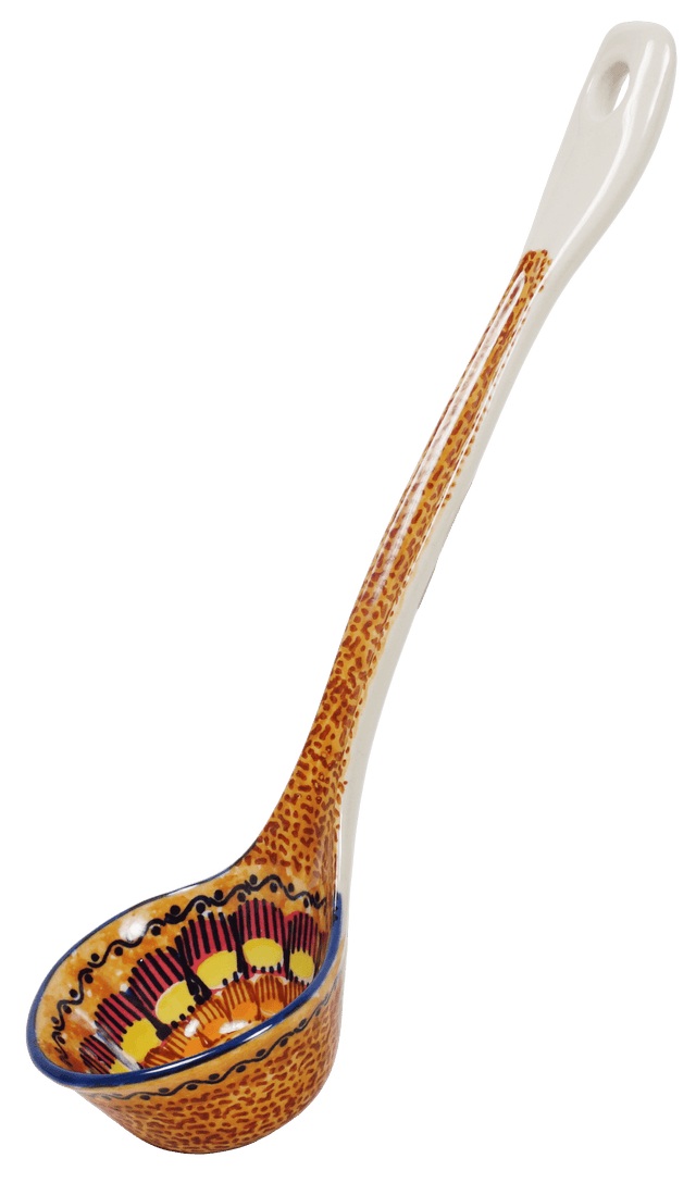 Introducing the exquisite Polish Pottery Ladle from Manufaktura, a true masterpiece crafted in the vibrant "Desert Sunrise" pattern. Imagine the warmth of a desert sunrise gracing your kitchen, as this 12-inch ladle boasts a harmonious blend of geometric shapes predominantly in brown, with lively accents of orange, blue, and yellow. The design is a visual feast, featuring an orange backdrop intermingled with tiny brown dots, encircled by radiant bands of yellow suns with blue rays and smaller orange suns with brown rays. Not only is this ladle a functional kitchen tool, but it also serves as a stunning piece of art that deserves to be displayed.