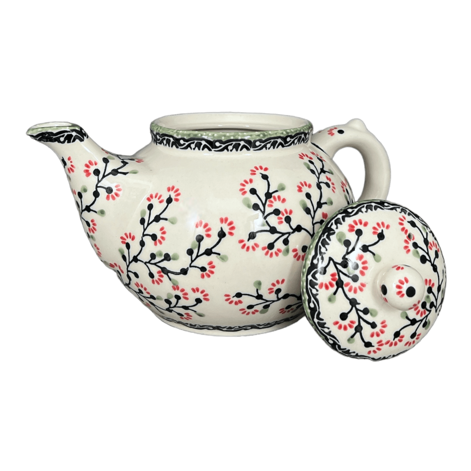 The "Cherry Blossoms" design is a masterpiece of artistry, featuring delicate black vines with vibrant red blossoms sprawling across a crisp white background, perfectly accented by a playful green dotted rim. This pattern isn't just beautiful; it's a mark of unparalleled craftsmanship. Each teapot is a Signature piece, meaning it's crafted by artists who have reached the pinnacle of their profession—true masters who oversee every detail from inception to completion. This limited oversight not only enhances the beauty of each teapot but also makes it a rare collector’s item adorned with the coveted "UNIKAT" stamp and the artist's own signature.