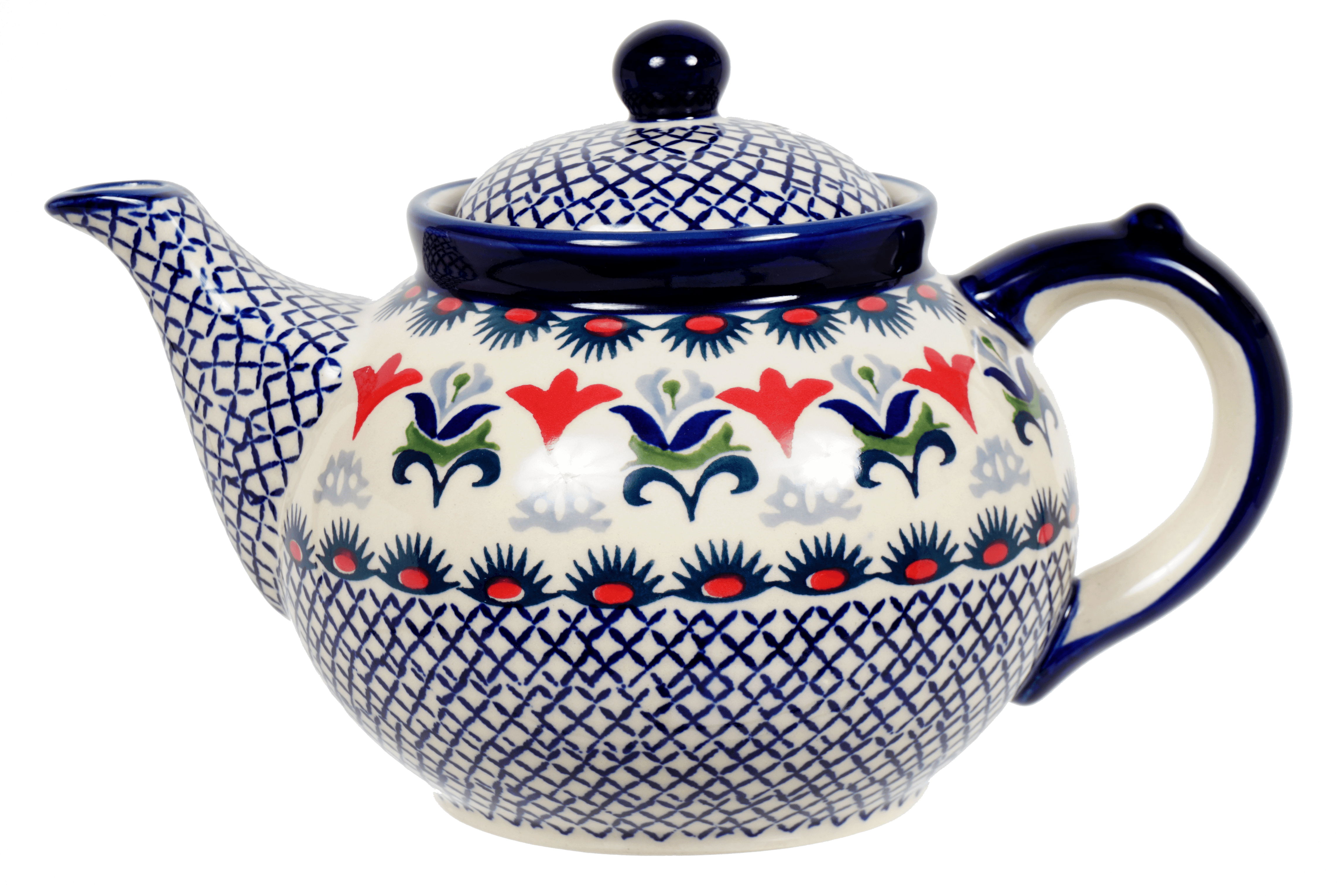 Imagine the charm of a quaint European tea time brought right to your home with the exquisite Manufaktura Polish Pottery Teapot. Crafted in the heart of Boleslawiec, Poland, this 1.5-liter teapot is not just a vessel for brewing your favorite teas but a piece of art that tells a story. The "Scandinavian Scarlet" pattern is a visual delight, featuring a crisp white background adorned with a mesmerizing blue geometric weave. Radiant red bellflowers and lush teal blue blossoms dance around the centerpiece, creating a tableau that's as vibrant as it is elegant. This unique design isn’t just painted; it’s a testament to the tradition of Unikat craftsmanship, showcasing intricate details and a riot of colors that only the most skilled artisans can achieve.