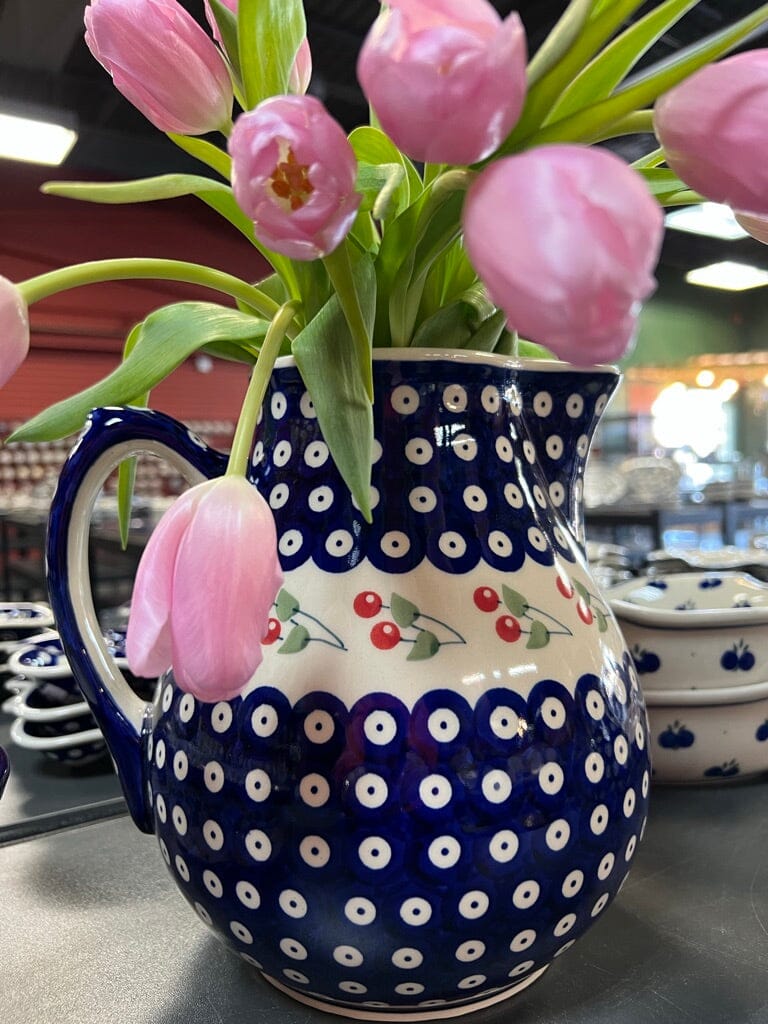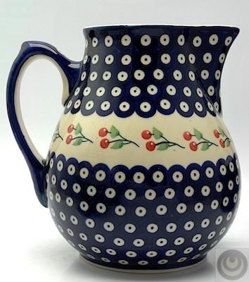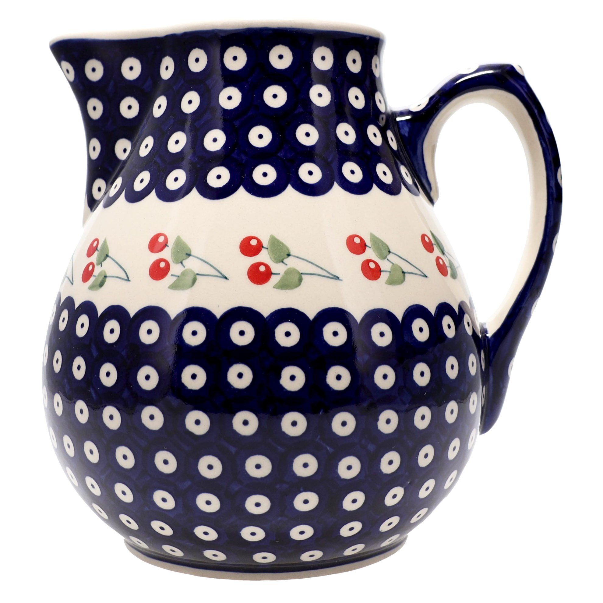 Dive into the details of the "Cherry Dot" design, where traditional artistry meets contemporary appeal. This pattern is a vibrant dance of white polka-dots set against a rich blue backdrop, encircled by playful red cherries on lush green stems. Each pitcher is a canvas where highly skilled artisans employ the "punching" technique of hand stamping, bringing to life the organic inspirations that surround them. As a piece celebrated in the Traditional level of Polish pottery, it represents a beloved staple in the craft’s rich heritage, offering a visual feast that is both familiar and inviting.