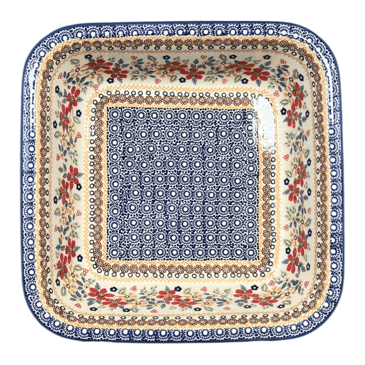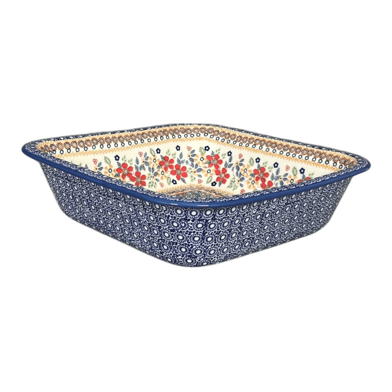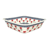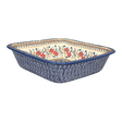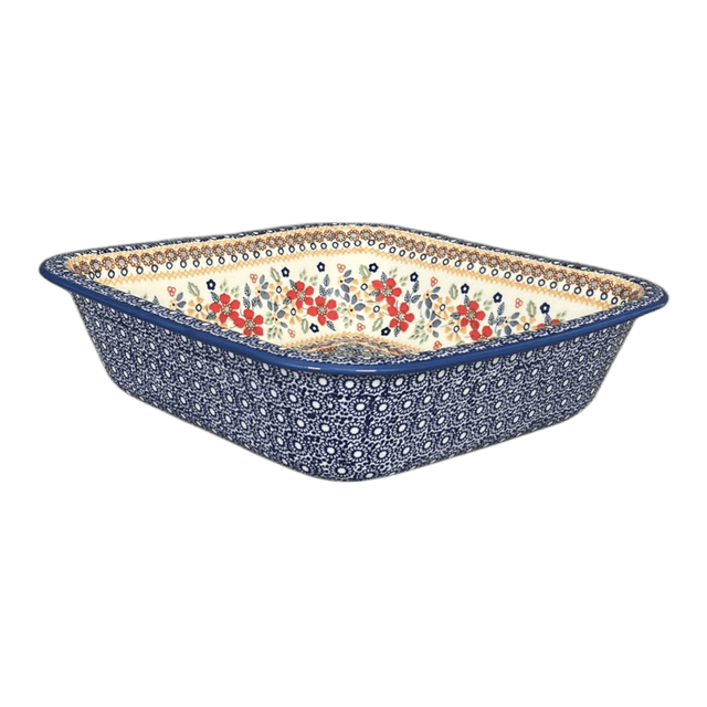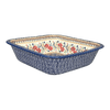 Imagine a kitchen where every dish you serve is a masterpiece, not just in flavor but in presentation as well. The Polish Pottery Baker from Manufaktura, measuring a generous 11.5" by 11.5", is your canvas to culinary creativity. Perfect for bubbling casseroles, crispy lasagnas, or even a decadent chocolate lava cake, this square baker is a must-have for anyone who believes that cooking is an art. Dressed in the vibrant "Ruby Duet" pattern, this piece features a mesmerizing dance of red, gold, white, and blue flowers, set against a pristine white background. The dense cluster of blue flowers at the center, encircled by a lively chain of red, orange, and blue blooms, brings a burst of color to any dining table.