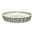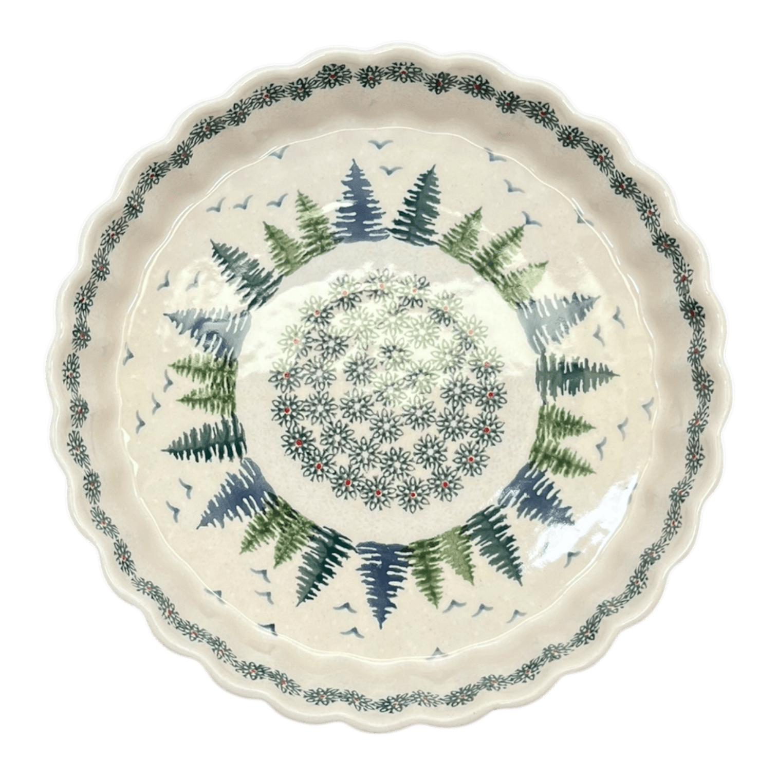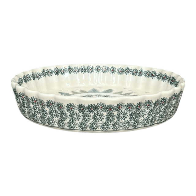 Imagine pulling a perfectly baked quiche out of the oven, its aroma filling the air, nestled snugly in a dish that's not just functional but a work of art. That's what the Medium 9" Polish Pottery Quiche Dish from Manufaktura offers. Handcrafted in the picturesque town of Boleslawiec, Poland, this dish features the enchanting "Pine Forest" pattern. The design showcases a serene blend of green and dusty blue pine trees encircling a lively array of green snowflake-shaped flowers, with playful birds scattered across a crisp white background. It’s not just a dish; it’s a portal to a snowy, pine-filled wonderland, ensuring that every culinary creation is wrapped in a story of artistic heritage.