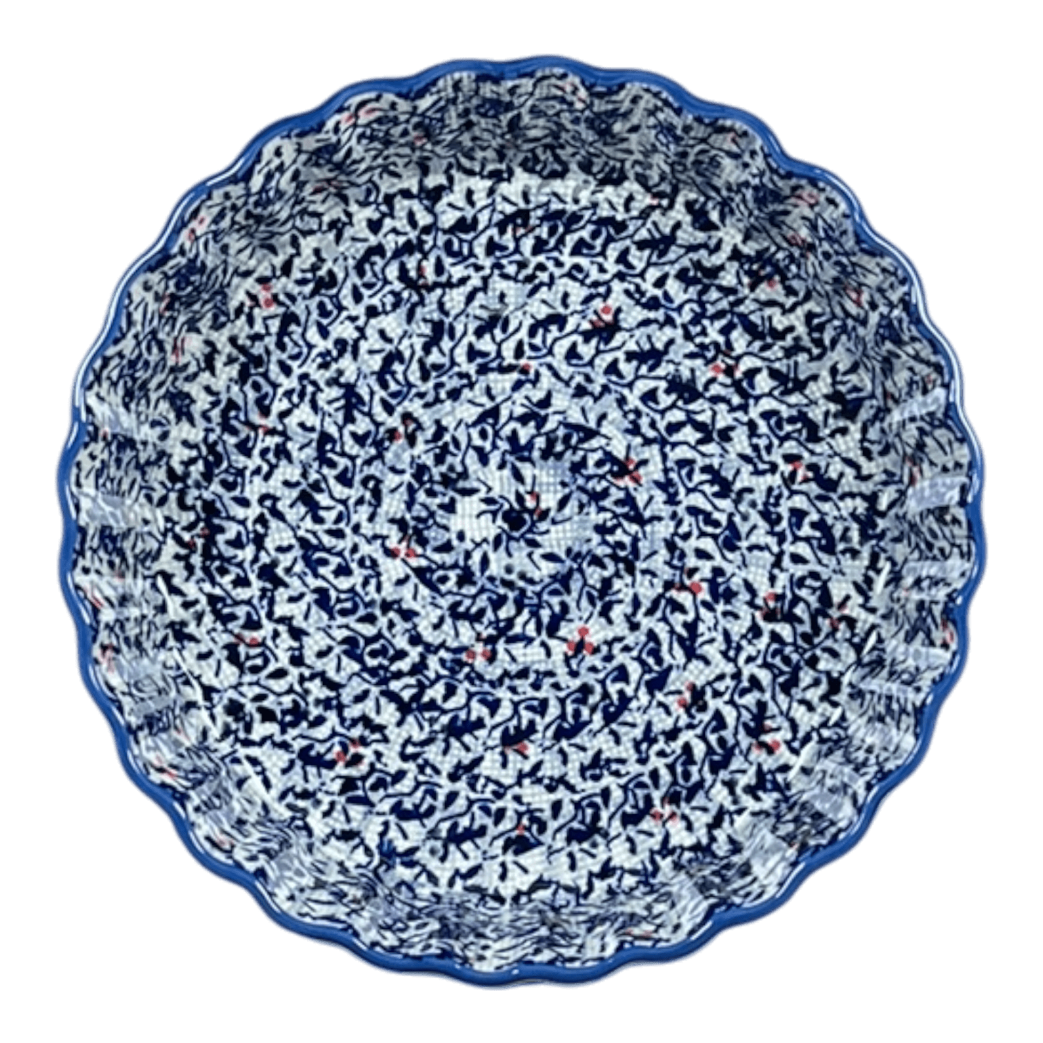 Imagine waking up to a lazy Sunday morning, the scent of a freshly baked quiche wafting through your kitchen. Now, picture that quiche served in a stunning Polish Pottery Quiche Dish from Manufaktura, featuring the captivating "Twilight Berries" pattern. This dish isn't just a cooking vessel; it's a piece of art, adorned with delicate leaf and berry motifs set against a serene light blue backdrop, interspersed with playful sets of tiny red dots. Each dish, a canvas of Unikat-level artistry, showcases an intricate dance of colors and elements, painstakingly hand-painted by the most skilled artisans in Boleslawiec, Poland. This isn't just pottery; it's a story of tradition and craftsmanship, baked right into your kitchen's aesthetic.
