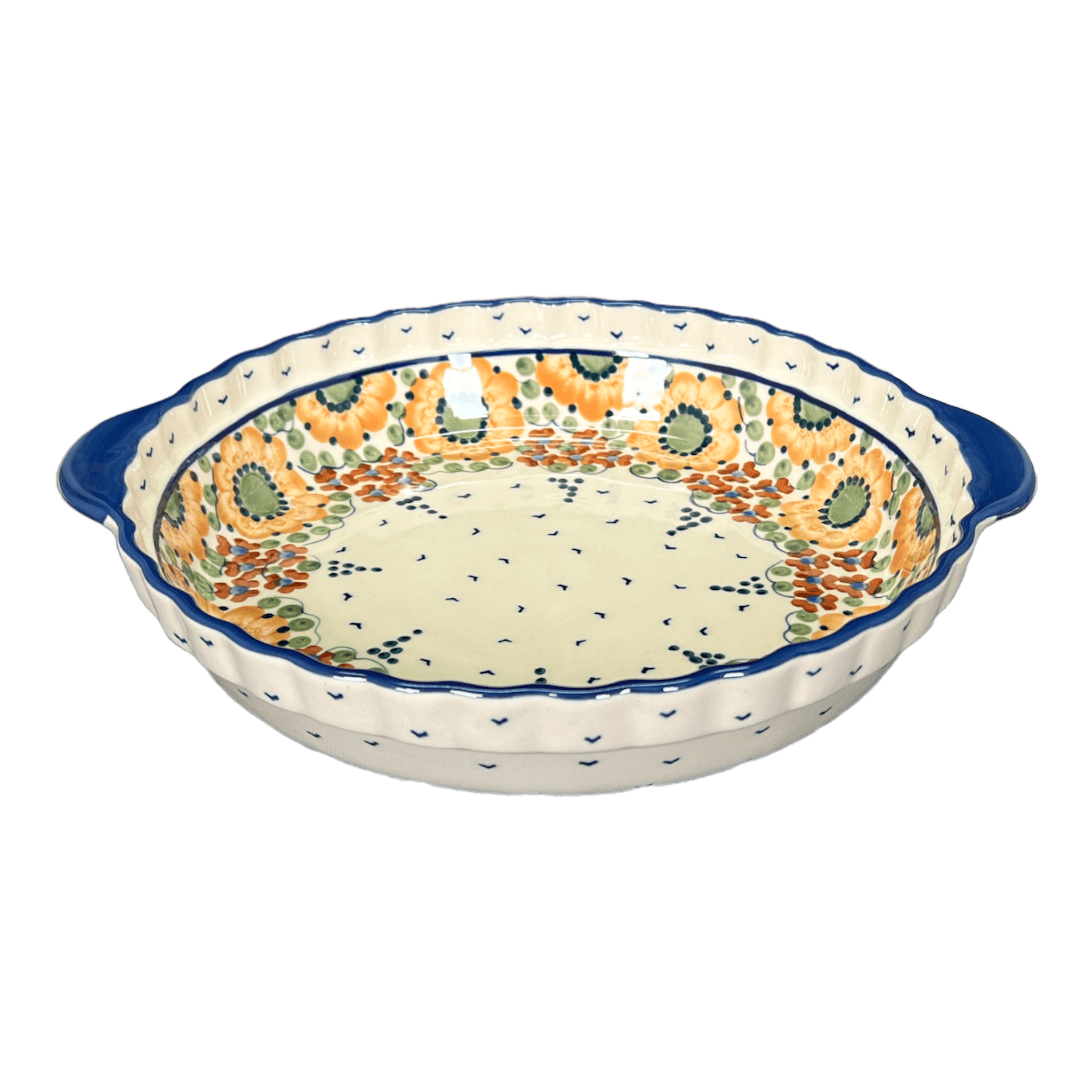 Introducing the enchanting Manufaktura Polish Pottery Baker, a 9.75" pie plate that transcends ordinary kitchenware. This exquisite piece, adorned with the captivating "Autumn Harvest" pattern, promises to elevate your baking and dazzle your dinner guests. Imagine the rustic charm of golden flowers and green accents, beautifully hand-painted on a pristine white background, bringing the warmth of autumn right into your kitchen. Each plate is a canvas, showcasing a unique blend of art and functionality, meticulously crafted by the skilled artisans of Boleslawiec, Poland. Whether it’s your famous apple pie or a hearty shepherd's pie, baking in this dish guarantees a masterpiece every time.