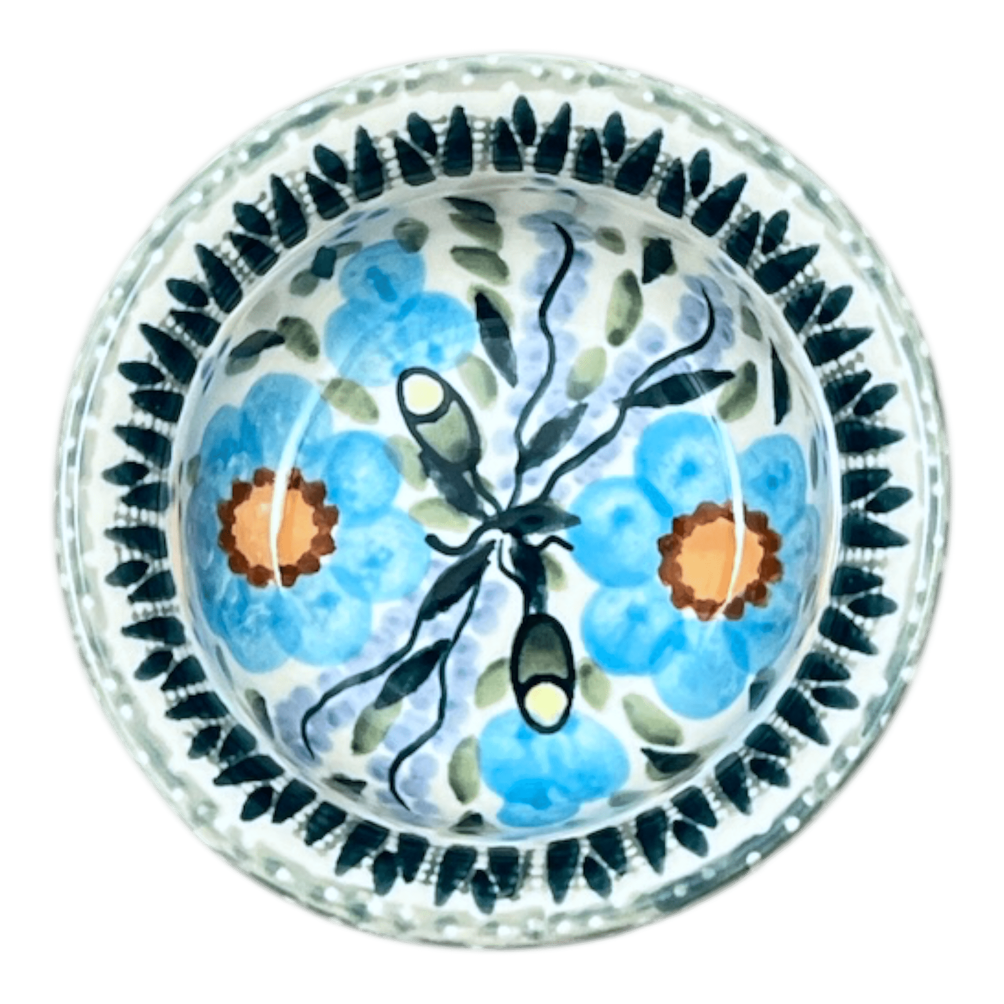 Introducing the Polish Pottery 3.5" Bowl by Manufaktura in the enchanting "Baby Blue Blossoms" pattern (JS49). This delightful bowl is not only perfect as a ramekin or dipping bowl, but it also features a captivating design that will bring a touch of whimsy to your table. The "Baby Blue Blossoms" pattern showcases a delightful blend of colors, predominantly light blue with accents of green, white, and gold. The white background sets the stage for a ring of teal green leaves in the center, while large, detailed sky blue and orange flowers dance around the edges. And let's not forget the tall grass in the background, adding a touch of natural beauty to this exquisite piece.