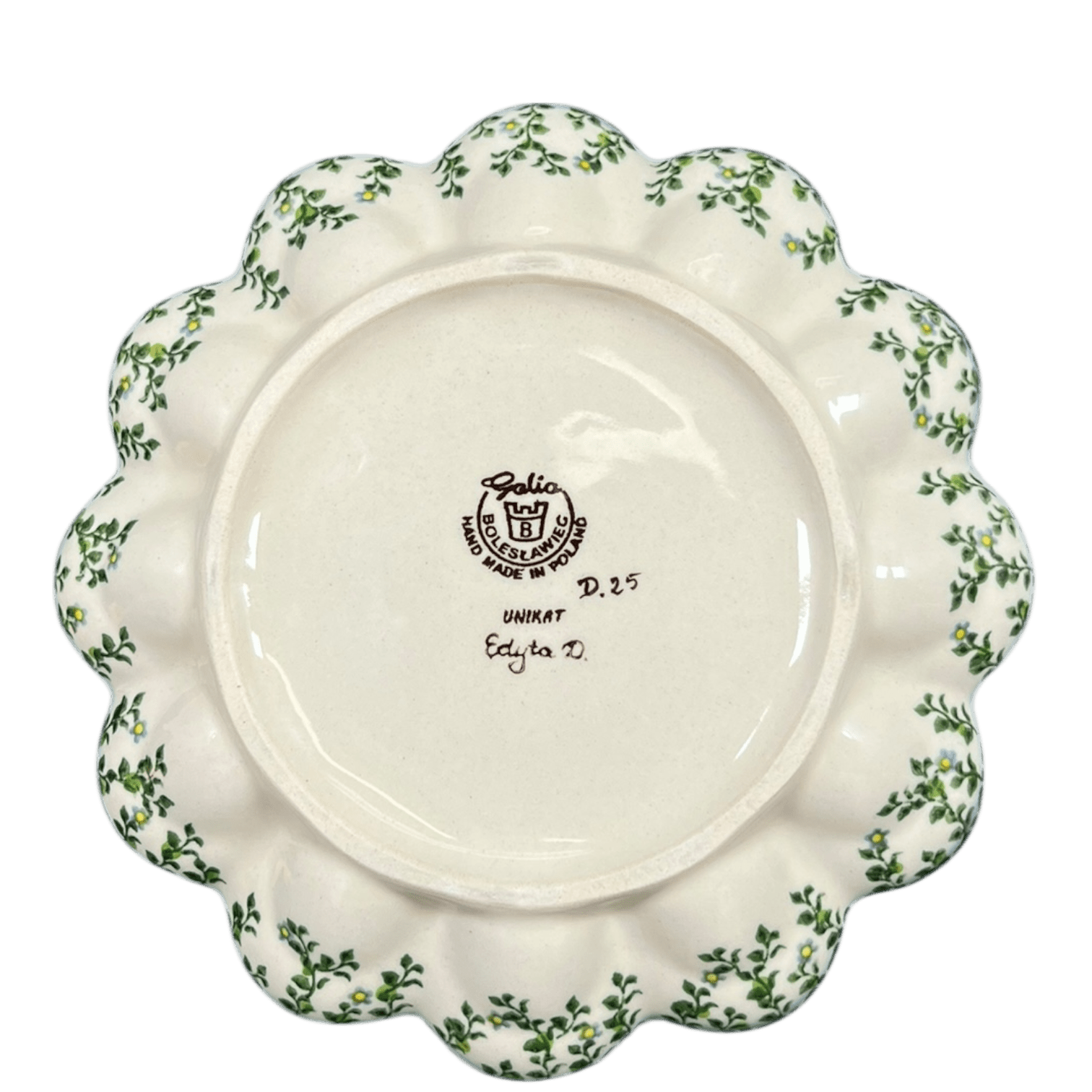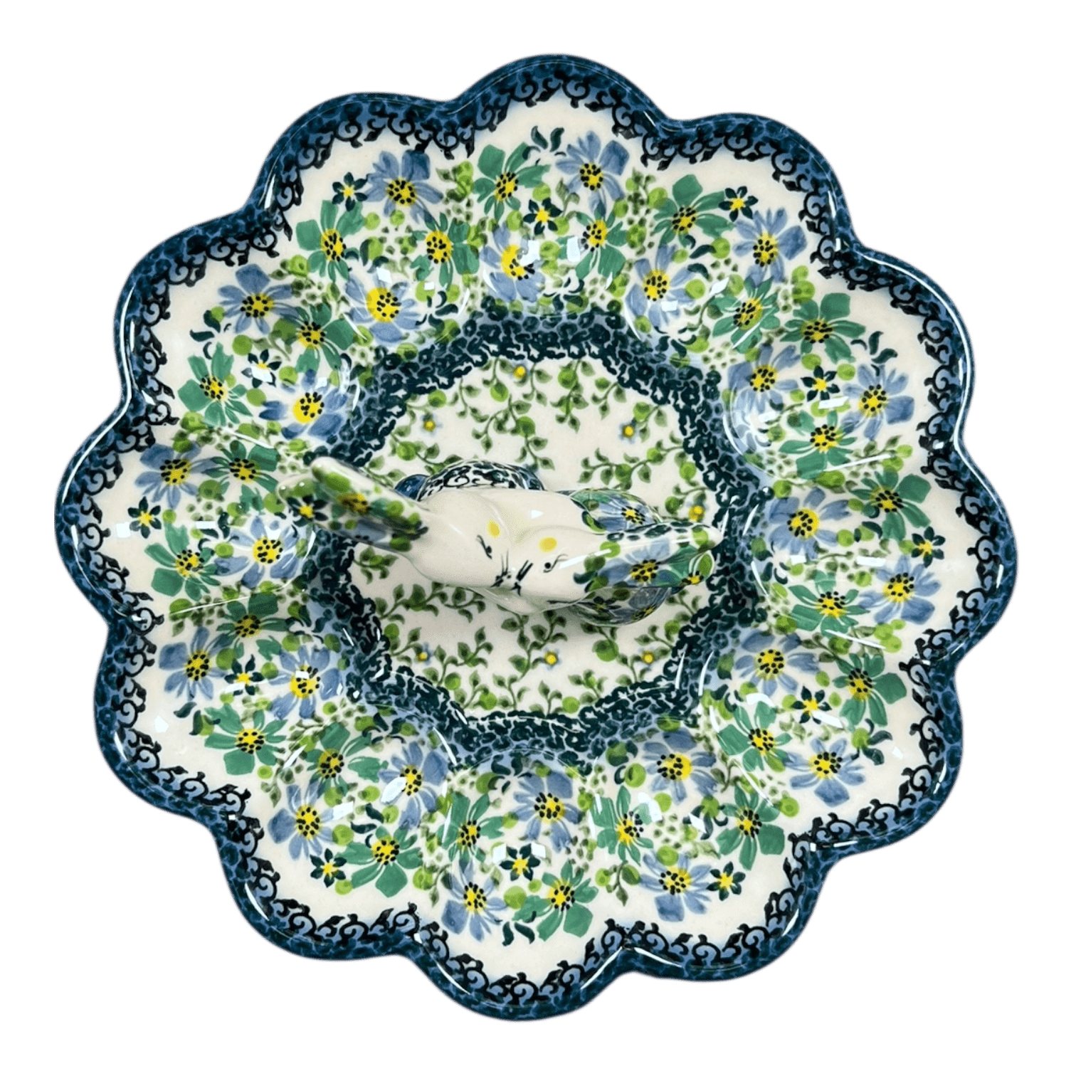 Imagine setting your table with a touch of enchanting spring any time of the year! Introducing the Polish Pottery Plate, Round, Egg Plate, 8.75" Bunny, Galia (GT14) in the mesmerizing "Blue & Green Dream" pattern. This delightful plate is not just a vessel for your deviled eggs or chocolate-covered strawberries; it's a centerpiece that captivates and charms. The vibrant pattern showcases large green and blue flowers with cheerful yellow centers, all beautifully set against a crisp white background. This artwork brings the freshness of a blooming garden right to your dining table, making every meal a picturesque event.