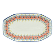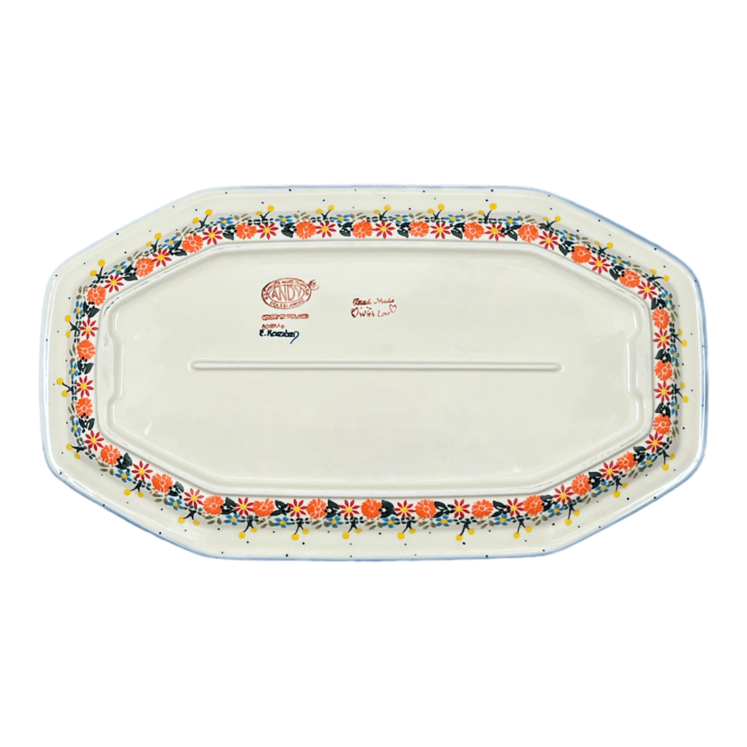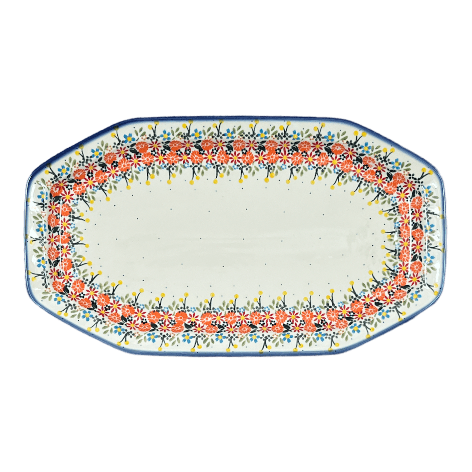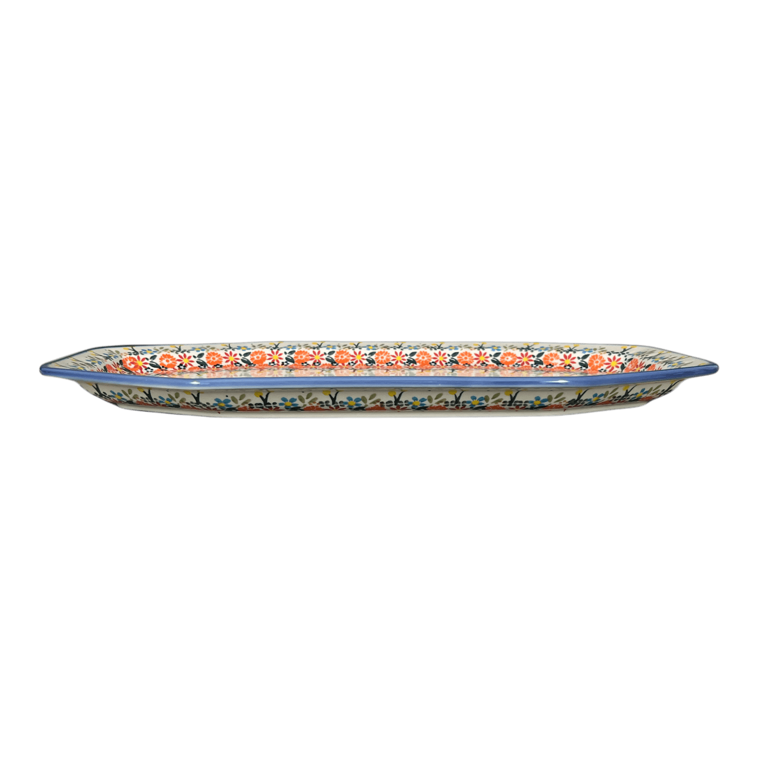 Introducing the vibrant and versatile Polish Pottery Tray, a dazzling centerpiece for any dining occasion! Crafted by the talented Andy from the small, family-owned factory in Boleslawiec, Poland, this 10.5" x 18.5" angular platter is a canvas painted with the lively "Bright Bouquet" pattern. Immerse yourself in a floral spectacle where bold orange blooms meet delicate red and light blue petals, accented by sprightly green leaves. Each flower is meticulously set against a crisp white background sprinkled with tiny blue dots, evoking a spring meadow under a clear sky. Perfect for serving anything from appetizers to main courses, this tray is sure to captivate and charm your guests.