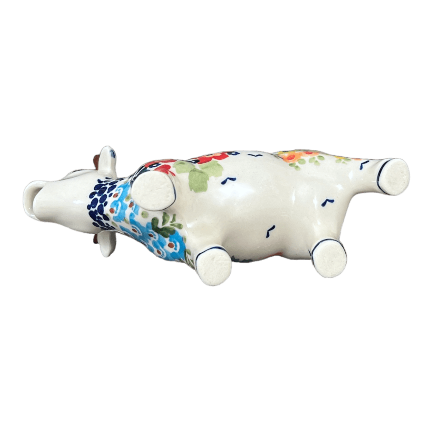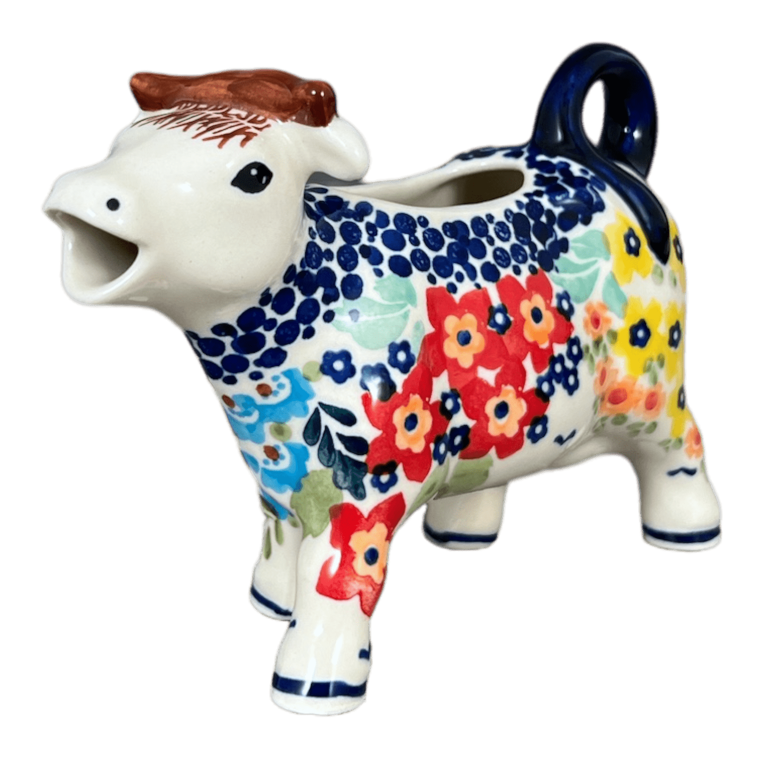 Introducing the charming Polish Pottery Creamer, a delightful 4 oz treasure molded by the skilled artisans of Manufaktura in the vibrant "Brilliant Garden" pattern. Imagine pouring cream from this playful cow-shaped creamer, with its luscious red, blue, white, and yellow floral design that seems to dance around its pristine white background. Not just a creamer, but a whimsical addition to your breakfast table that's sure to spark conversation and bring a smile to your morning routine. Hand-painted in Boleslawiec, Poland, this piece isn't just functional—it's a splash of fun and color that brightens your day!