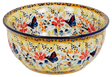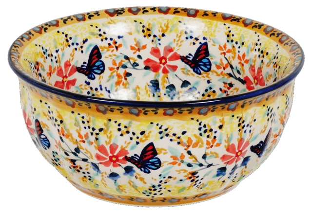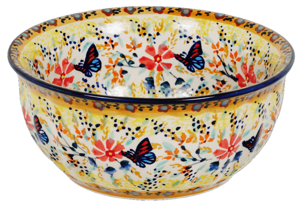 Imagine a dash of whimsy and a splash of color lighting up your dining table! That's exactly what the Polish Pottery Bowl from Manufaktura offers with its enchanting "Butterfly Bliss" pattern. This delightful 6.5" bowl is not just a vessel for your favorite soups, salads, or pastas, but a piece of art meticulously crafted in Boleslawiec, Poland. The vibrant design features playful butterflies and an array of floral motifs in a cheerful palette of yellow, blue, pink, and green, set against a crisp white and turquoise background dotted with blue. It's a perfect conversation starter and a joy to behold at every meal.