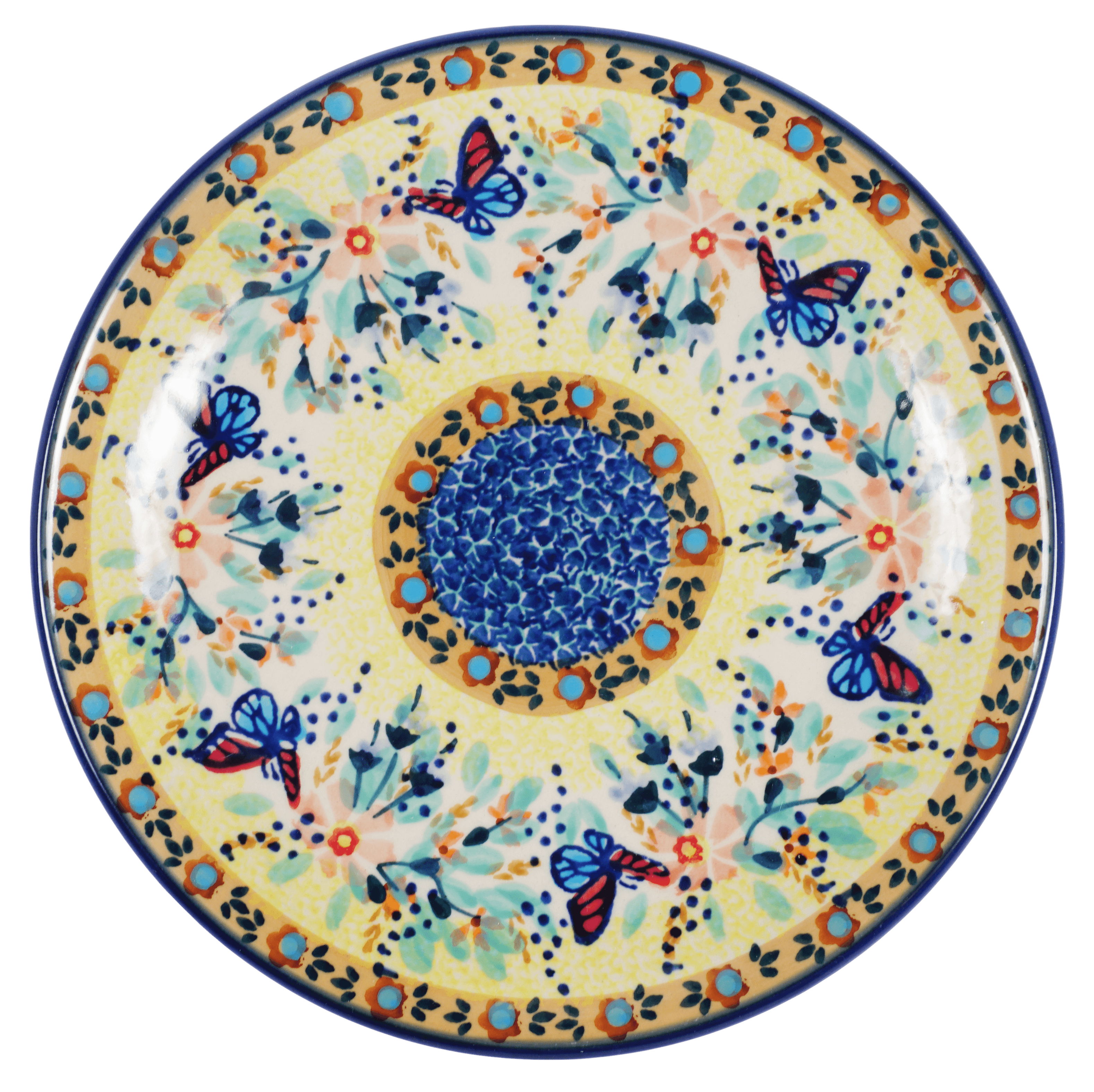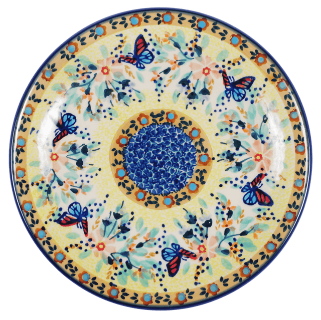 Introducing the Polish Pottery 7.25" Round Dessert Plate by Manufaktura in the whimsical "Butterfly Bliss" pattern (WK73). Prepare to turn heads at your next dinner party with these eye-catching table settings from Boleslawiec. Delicate yet durable, these heirloom quality dessert plates are perfect for indulging in sweet treats after a delicious main course. The "Butterfly Bliss" pattern is a burst of color, featuring vibrant yellow, blue, pink, and green accents that will bring a touch of joy to any table.