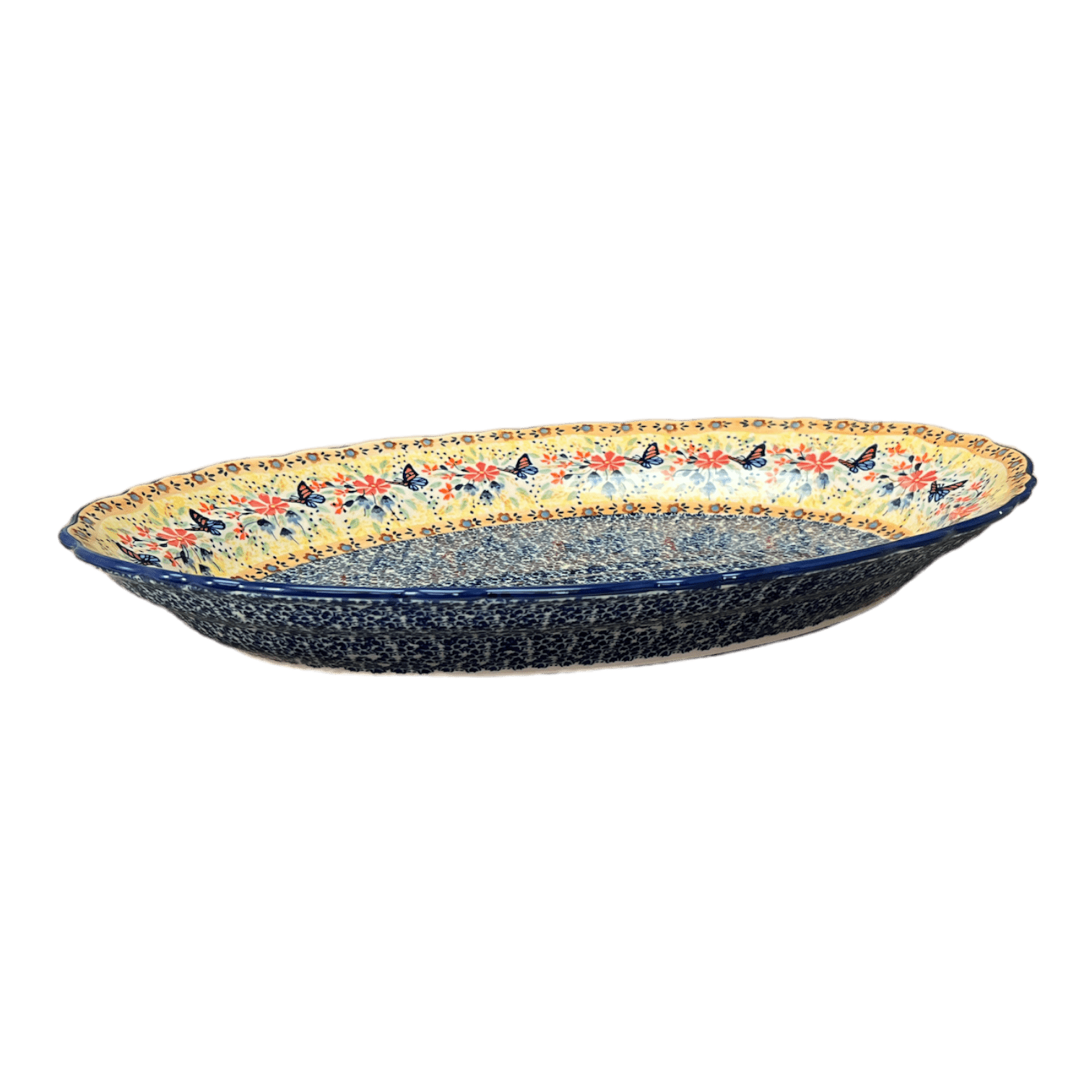 Imagine a canvas where vibrant butterflies dance amidst lush floral blooms, each detail meticulously hand-painted by the skilled artisans of Manufaktura in the heart of Boleslawiec, Poland. This isn't just any canvas, however; it's the stunning "Butterfly Bliss" pattern that adorns the Polish Pottery Platter, a piece that brings both the art of dining and the art of design to your table. This large, oval, scalloped platter, measuring an impressive 16.75" x 12.25", is not only a feast for the eyes with its predominantly yellow color accented with hues of blue, pink, and green, but also a testament to the highest level of craftsmanship, denoted by the coveted "UNIKAT" stamp signaling a Signature piece.