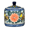 Introducing the enchanting "Butterfly Parade" sugar bowl from the master ceramists at Ceramika Artystyczna! This exquisite piece captures the whimsy of a butterfly flitting through a floral meadow, with delicate blue butterflies adorned with peach spots fluttering around vibrant peach-colored flowers and lush green leaves. The playful pattern is beautifully framed by charming blue squares, adding a touch of rustic elegance to this 4-inch square treasure. Handcrafted in Boleslawiec, Poland, this sugar bowl is not just a container, but a piece of art that brings the magic of nature right into your kitchen.