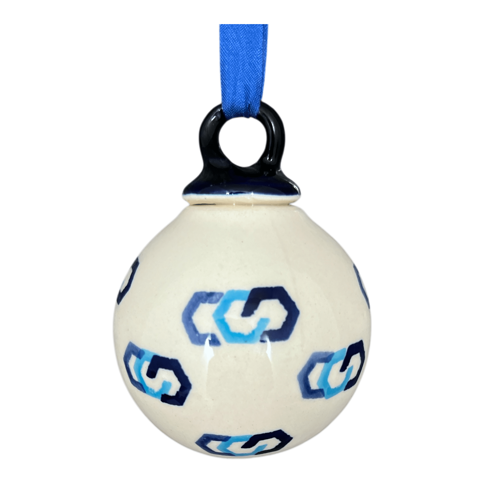 Imagine a winter evening, the air crisp and the festive spirit palpable. Amid this enchanting setting, the Polish Pottery Ornament from Manufaktura, with its mesmerizing "Chain Reaction" pattern, emerges as a star of your holiday decor. This exquisite 2.75" ball is a tapestry of cobalt and light blue hues, elegantly intertwined in a geometric dance that captures the eye and warms the heart. Handcrafted in the historic town of Boleslawiec, Poland, each ornament is a testament to the meticulous skill of the artisans. The vibrant colors and intricate design are not just decorative but hold the whispers of centuries-old pottery traditions.