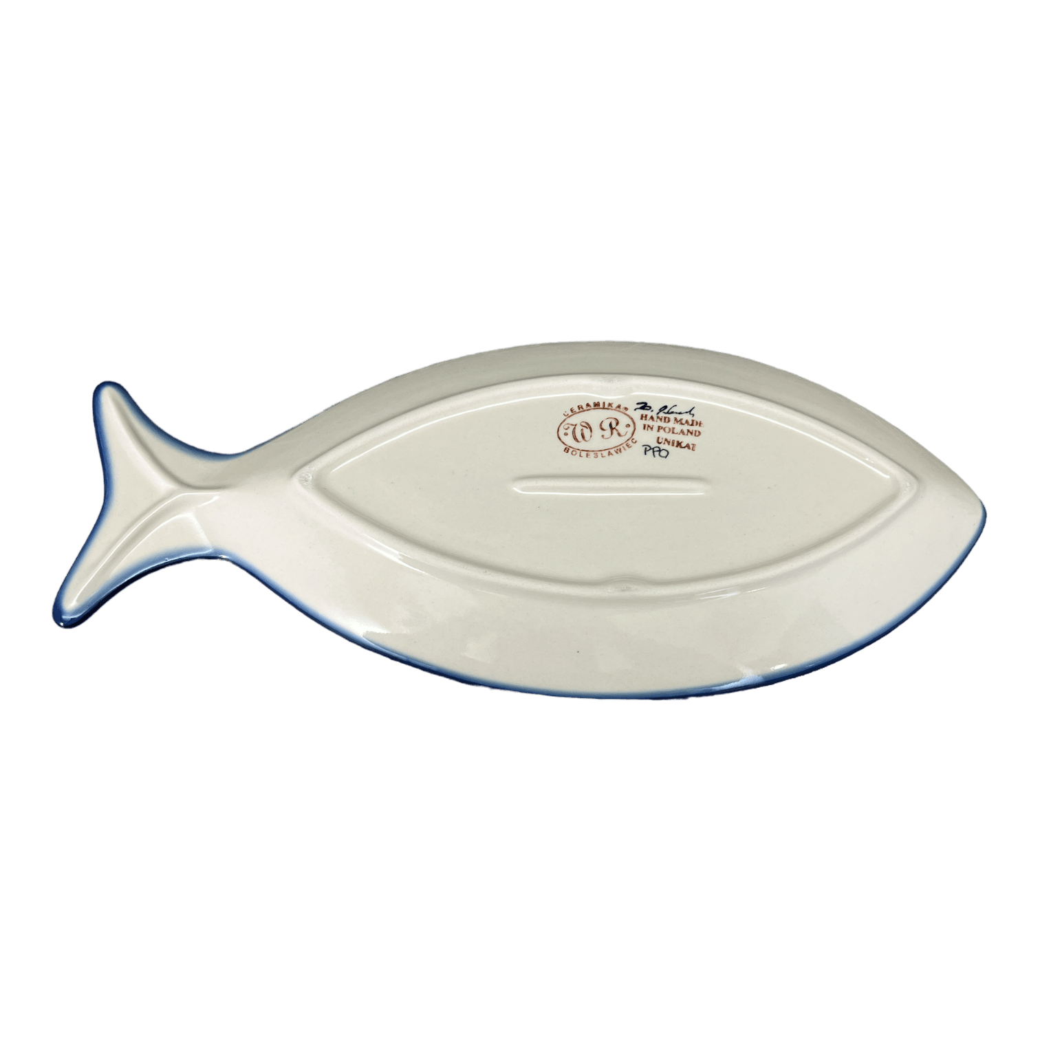 Introducing the charming and versatile Polish Pottery 14.5" x 6.5" Fish Plate by W.R. Ceramika in the captivating "RC4" pattern. This delightful fish-shaped platter is not only a stunning addition to your tableware collection, but it also serves a multitude of purposes. From serving bread and appetizers to showcasing desserts and sushi, this plate is a true all-rounder. And, of course, what better way to serve fish than on a fish-shaped platter!