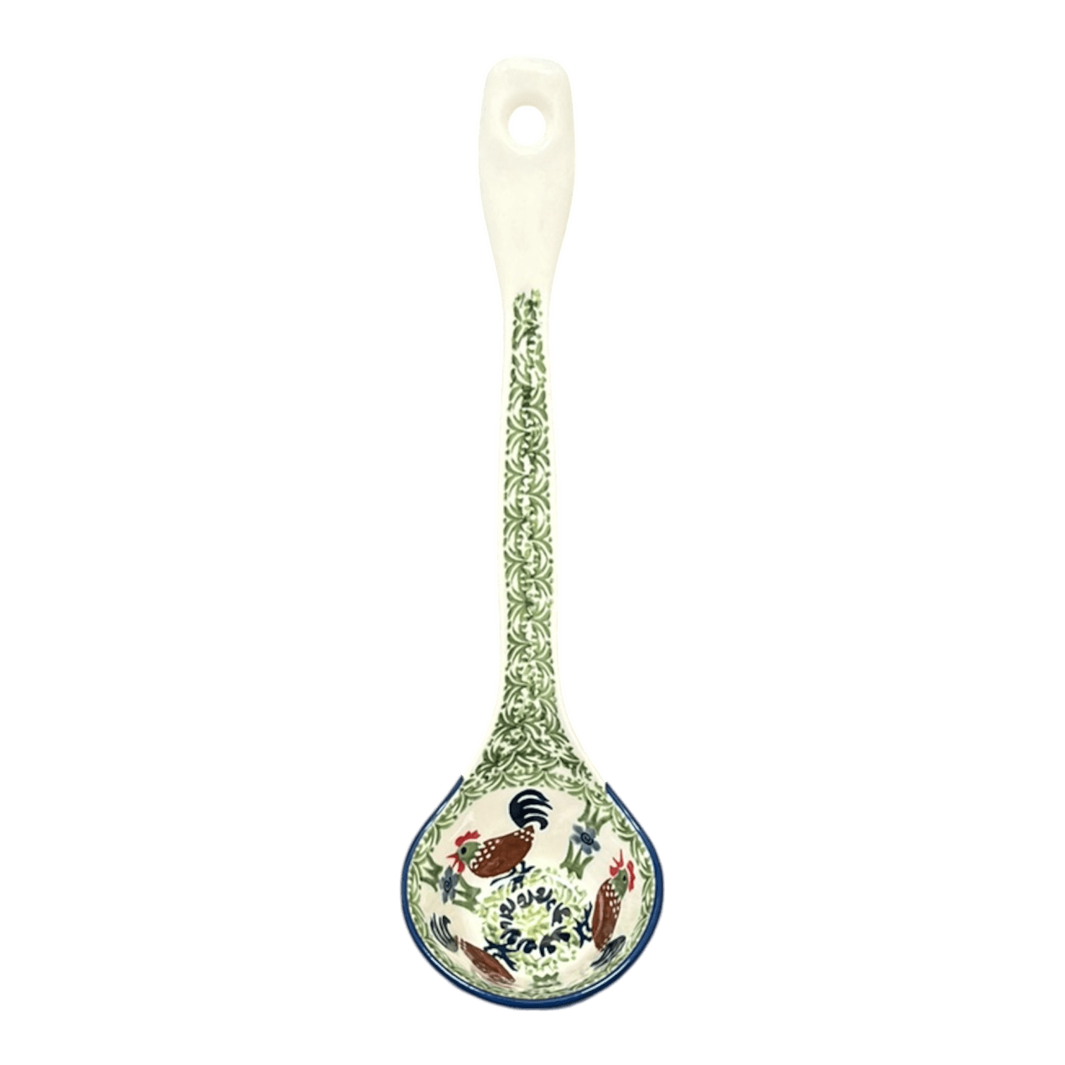 More than just a tool for serving your favorite soups and stews, this ladle is a conversation starter. Hang it proudly on your kitchen wall after the meal to let the "Chicken Dance" pattern continue to enchant. The bold colors and playful scene are sure to catch the eye and spark discussions about its origin and craftsmanship. Hand-painted in Boleslawiec, Poland, this kitchen gem reflects a tradition of pottery-making that is as rich in history as it is in color. Safe for use in the dishwasher, microwave, and even the oven (up to 425 degrees), this ladle is not only a decorative piece but a functional one that meets all your kitchen needs.