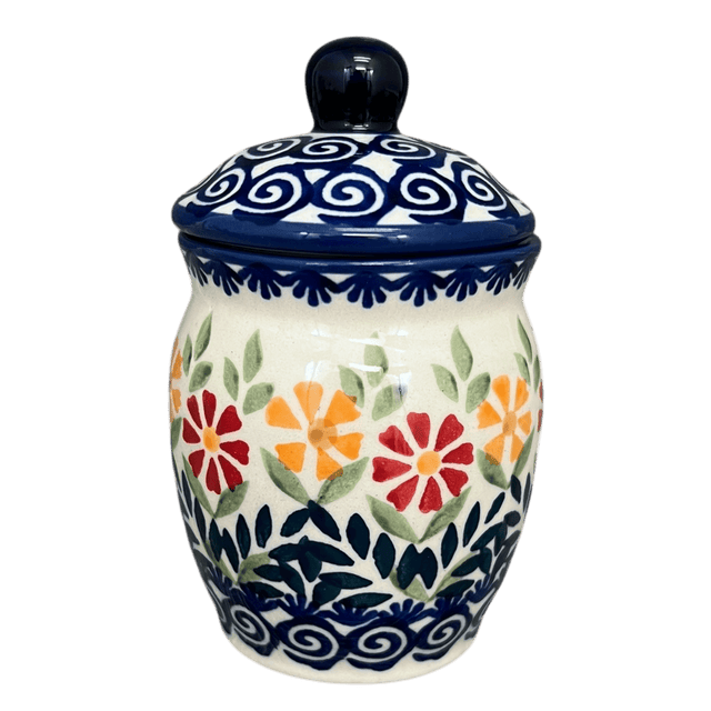 Introducing the vibrant and charming Polish Pottery Canister, a quaint 0.25-liter masterpiece from Manufaktura, adorned with the playful "Flower Power" pattern. Standing at a petite 4.5 inches, this canister is not just a container, but a burst of color and joy that captures the essence of traditional Polish craftsmanship. Ideal for those kitchen nooks and crannies, it serves perfectly as a home for your spices, condiments, or even your favorite jams. The delightful swirls of blue and green, punctuated by bold red and orange flowers on a crisp white background, invite a touch of spring into your pantry all year round.