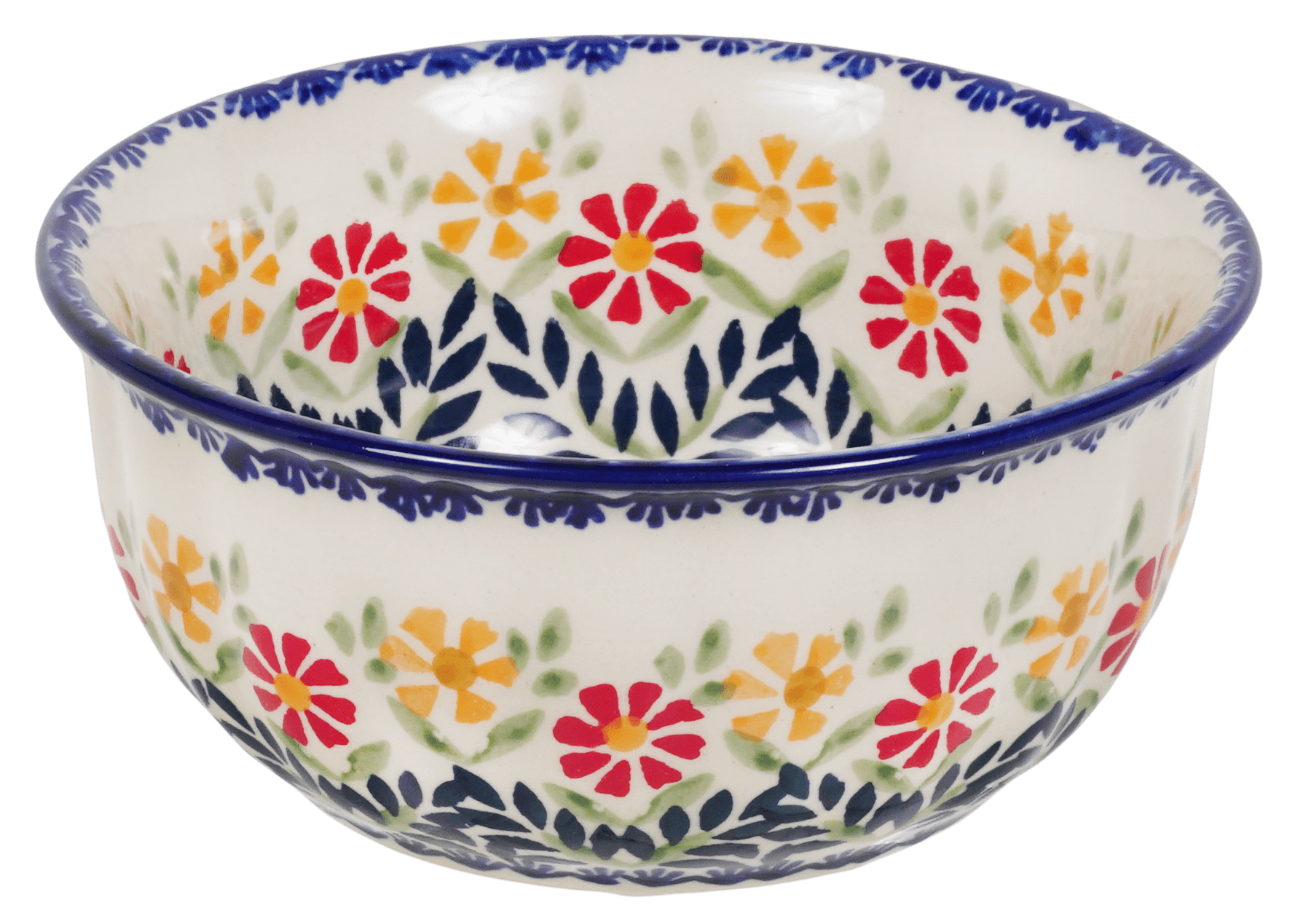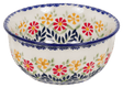 Introducing the Polish Pottery 5.5" Bowl by Manufaktura in the vibrant and captivating "Flower Power" pattern (JS14). This delightful bowl is not just your average kitchenware; it is a versatile piece that adds a splash of color and fun to your dining experience.
