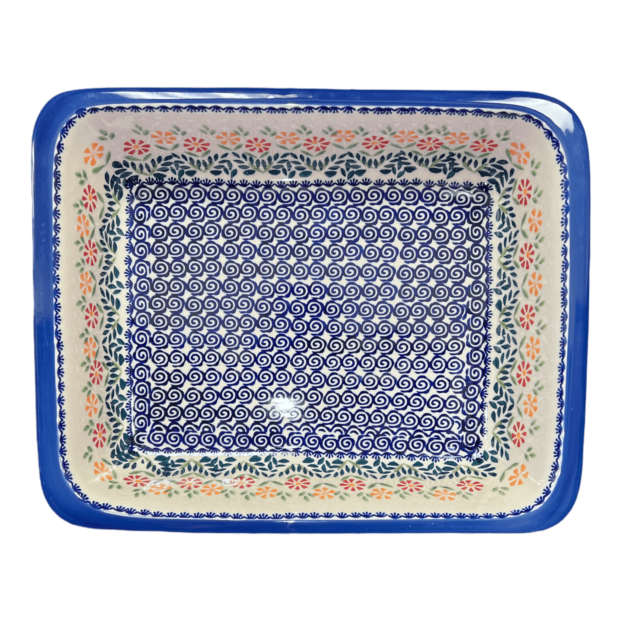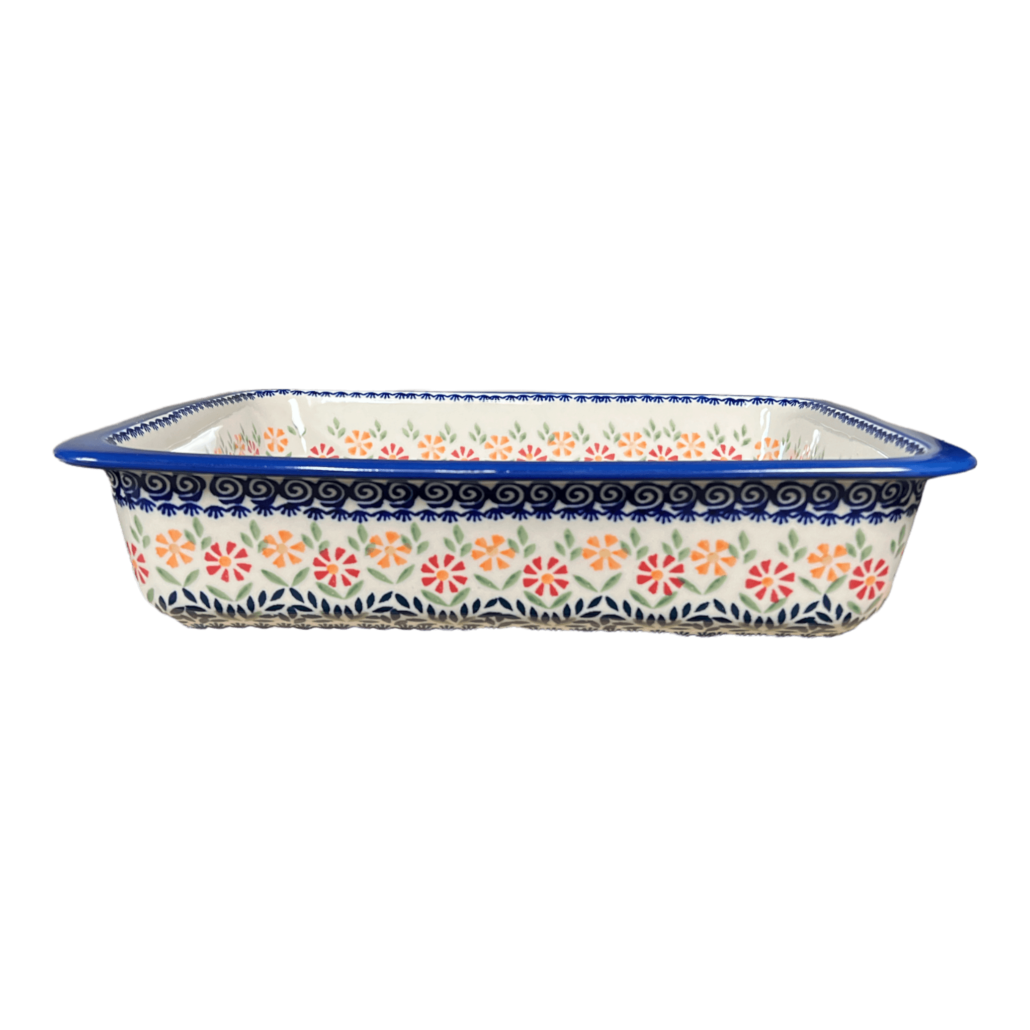 Step into a world of vibrant colors and enchanting patterns with the Manufaktura Polish Pottery Baker, a masterpiece crafted in the heart of Boleslawiec, Poland. This deep dish, family-sized lasagna pan is not just a cooking vessel—it's a portal to a tradition of artistry. Decorated in the eye-catching "Flower Power" pattern, the baker features a whimsical blend of red and orange flowers, swirling blue accents, and a ring of green leaves set against a crisp white background. Each piece, meticulously hand-painted by skilled artisans, brings the magic of Polish folklore right into your kitchen.