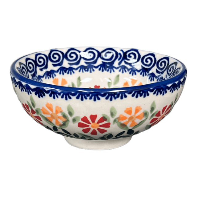 Introducing the Polish Pottery 4.25" Dipping Bowl by Manufaktura in the vibrant and captivating "Flower Power" pattern (JS14). Dive into the world of Polish Pottery with this exquisite dipping bowl that features a mesmerizing design incorporating flowers and swirls in a predominantly red color, accented with hints of orange and blue. The pattern showcases a white background adorned with intricate blue swirls in the center, surrounded by a delightful ring of green leaves. As you venture further out, you'll discover large, bold red and orange flowers that add a pop of color to this artistic masterpiece.