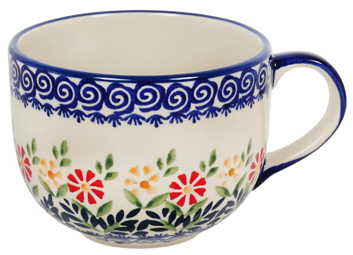 Introducing the Polish Pottery Large Latte/Soup Cups by Manufaktura in the vibrant and eye-catching "Flower Power" pattern (JS14). These wide mugs are not only perfect for enjoying your favorite soup, chili, coffee, or tea, but they also add a pop of color and style to your kitchen.