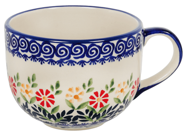 With a generous capacity of 18 oz (2.25 cups), a width of 5.75" (including the handle), and a height of 3.5", these cups are both practical and beautiful. Made and hand-painted in Boleslawiec, Poland by skilled artisans, they are a testament to the rich tradition of Polish pottery. Mix and match different pieces to create stunning combinations that will impress your guests and add a touch of elegance to any occasion.