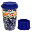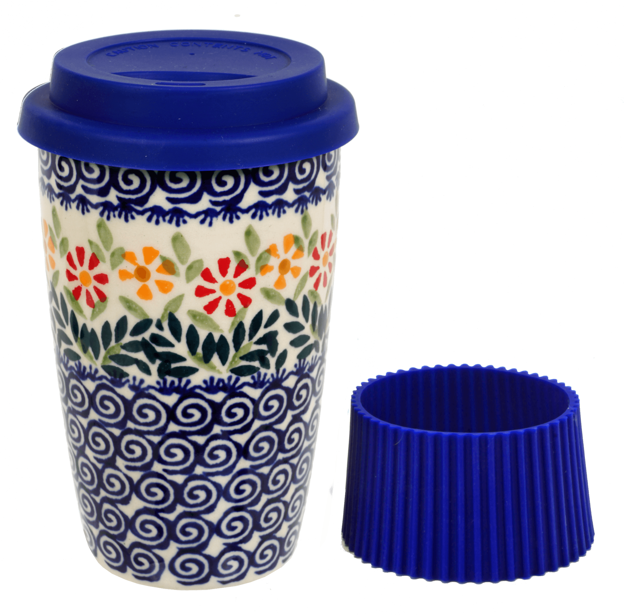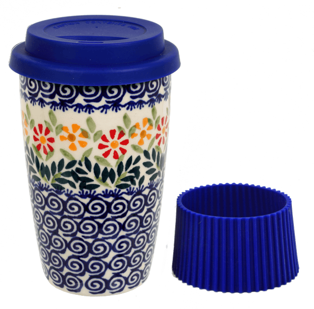 Embark on a vibrant journey with the Manufaktura Polish Pottery Mug in the dazzling "Flower Power" pattern. This 14 oz travel mug is not just a container, but a piece of art, bursting with colors that pop and designs that dance around the surface. The pattern features a delightful combination of blue swirls and green leaves, encircled by large, playful flowers in bold red and orange, set against a crisp white background. It’s a visual celebration, crafted to brighten your day whether you're on a morning commute or a weekend adventure. The included silicone lid and sleeve ensure your beverage stays warm while making it easy to take your art on the go!