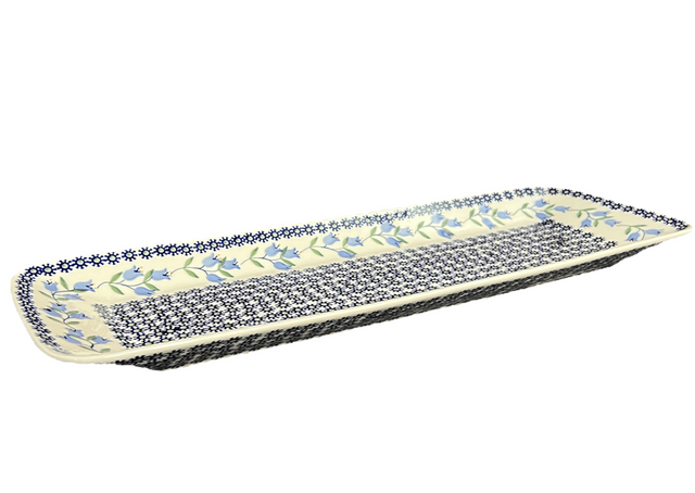 Imagine setting your table with a piece of art that serves up more than just style. Introducing the Polish Pottery Platter from Manufaktura, a long, rectangular delight that transforms every meal into a festive gathering. This 19.5" x 6.75" platter is perfect for displaying an array of hors d'oeuvres, cheeses, freshly baked bread, or sweet treats. Each piece is lovingly hand-painted in Boleslawiec, Poland, by artisans whose skill shines through in every detail. The vibrant "Lily of the Valley" pattern features a charming dance of blue and green blossoms set against a crisp white background, promising to enchant your guests and add a splash of color to your home decor.